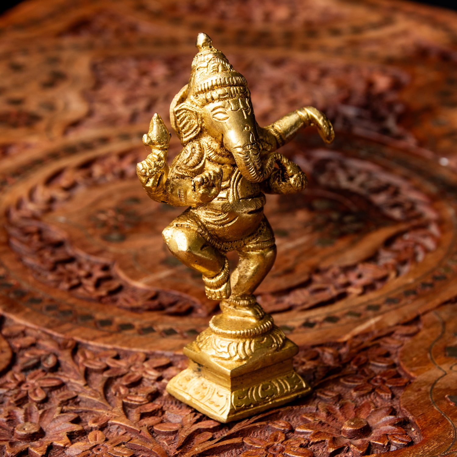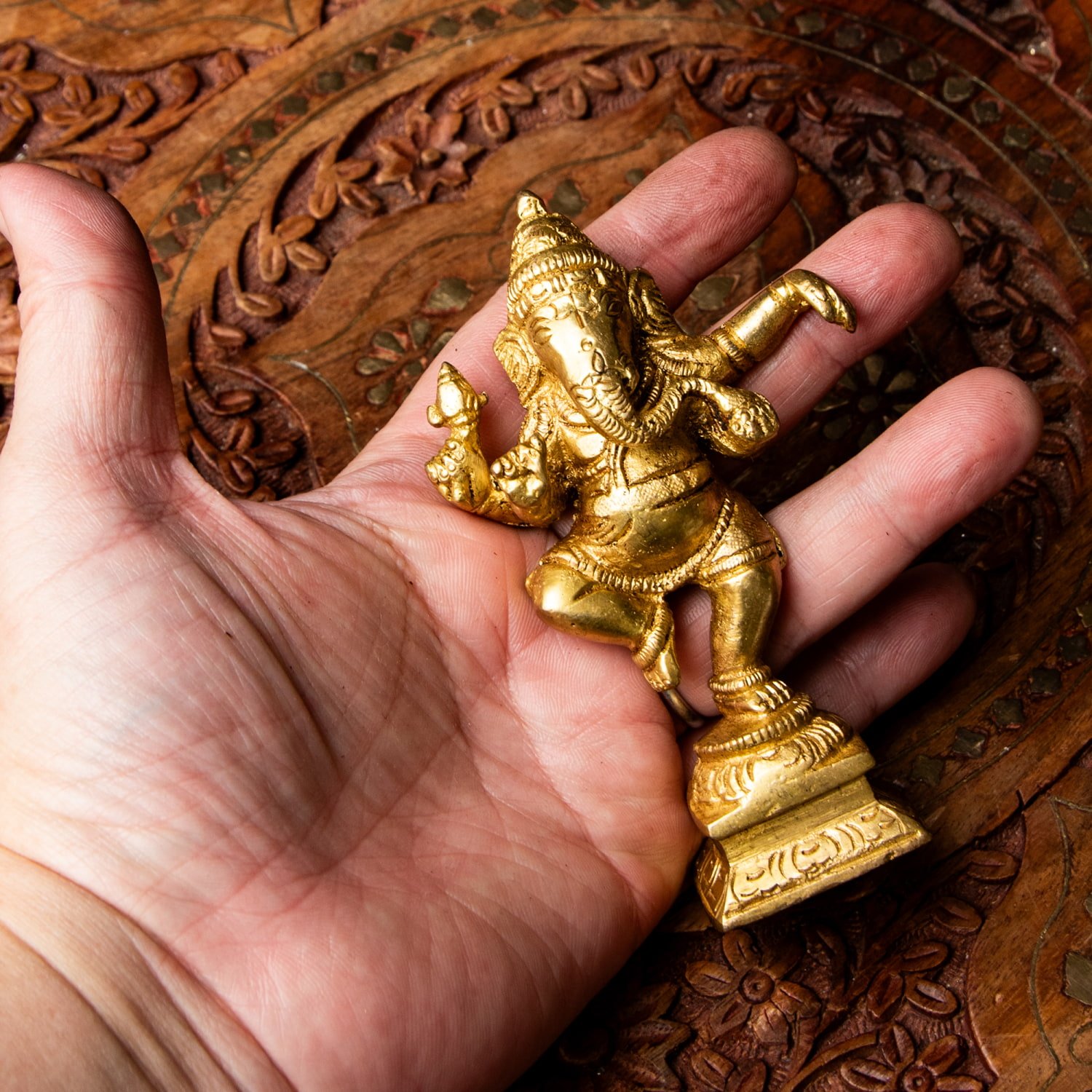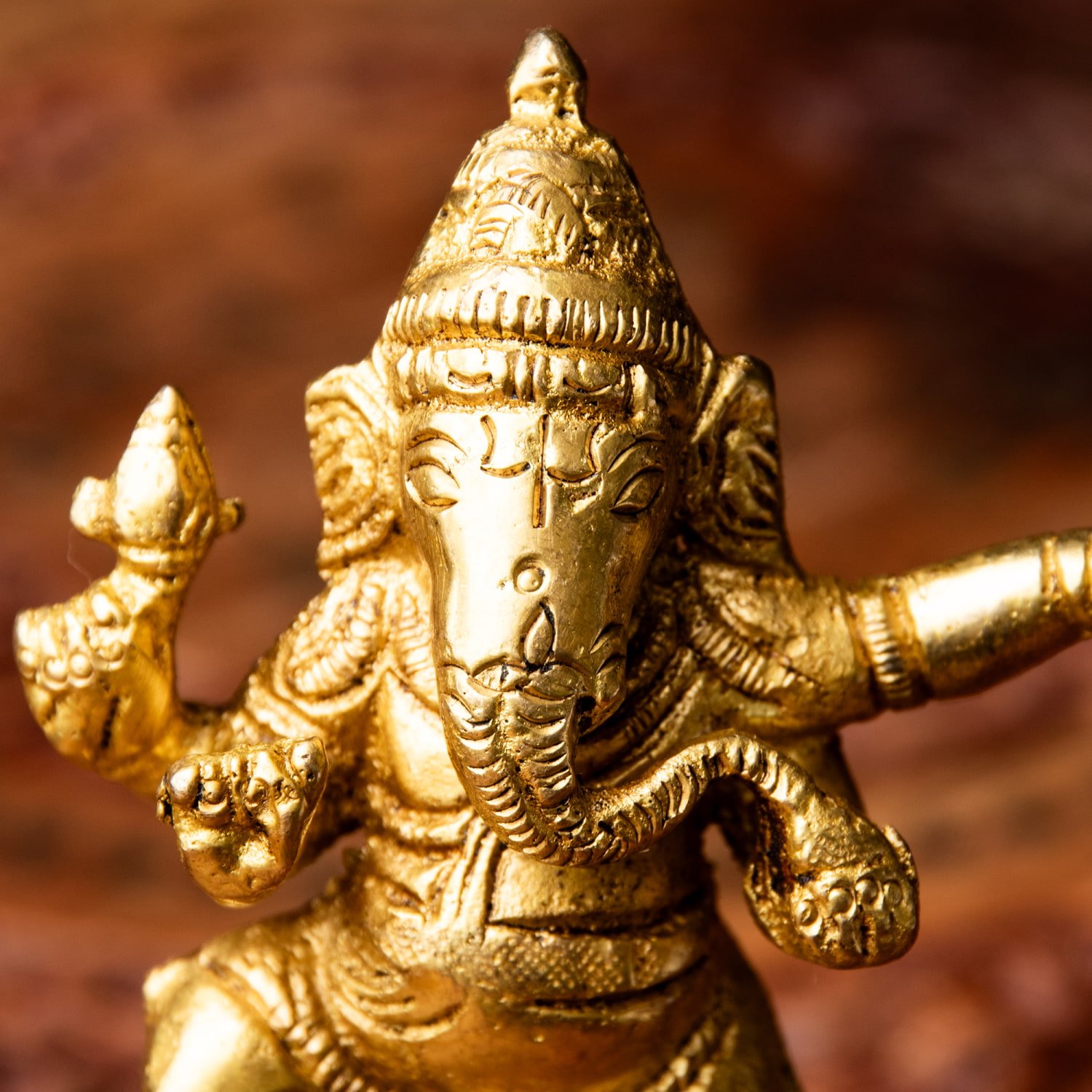 楽器を奏でたり、踊ったり、本を読んだり書いたり、時にはリラックスして寝転がっていたり…多彩なお姿からはその人気ぶりが伺えます。世界一長い物語とも言われるインドの叙事詩『マハーバーラタ』を筆記したのもガネーシャ神だと語られます。音楽や踊りの舞台では、プログラムの最初にガネーシャに祈りを捧げる習慣があります。あらゆる障害を破壊し、願い事の成就へと導いて下さるガネーシャ神は、学問から商売繁盛まで幅広い分野のご利益で信仰され、インドのみならずタイなどの東南アジアでも人気を誇っているのです。| 素材 | ブラス |