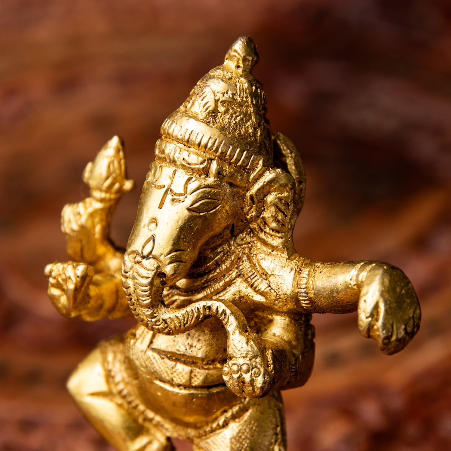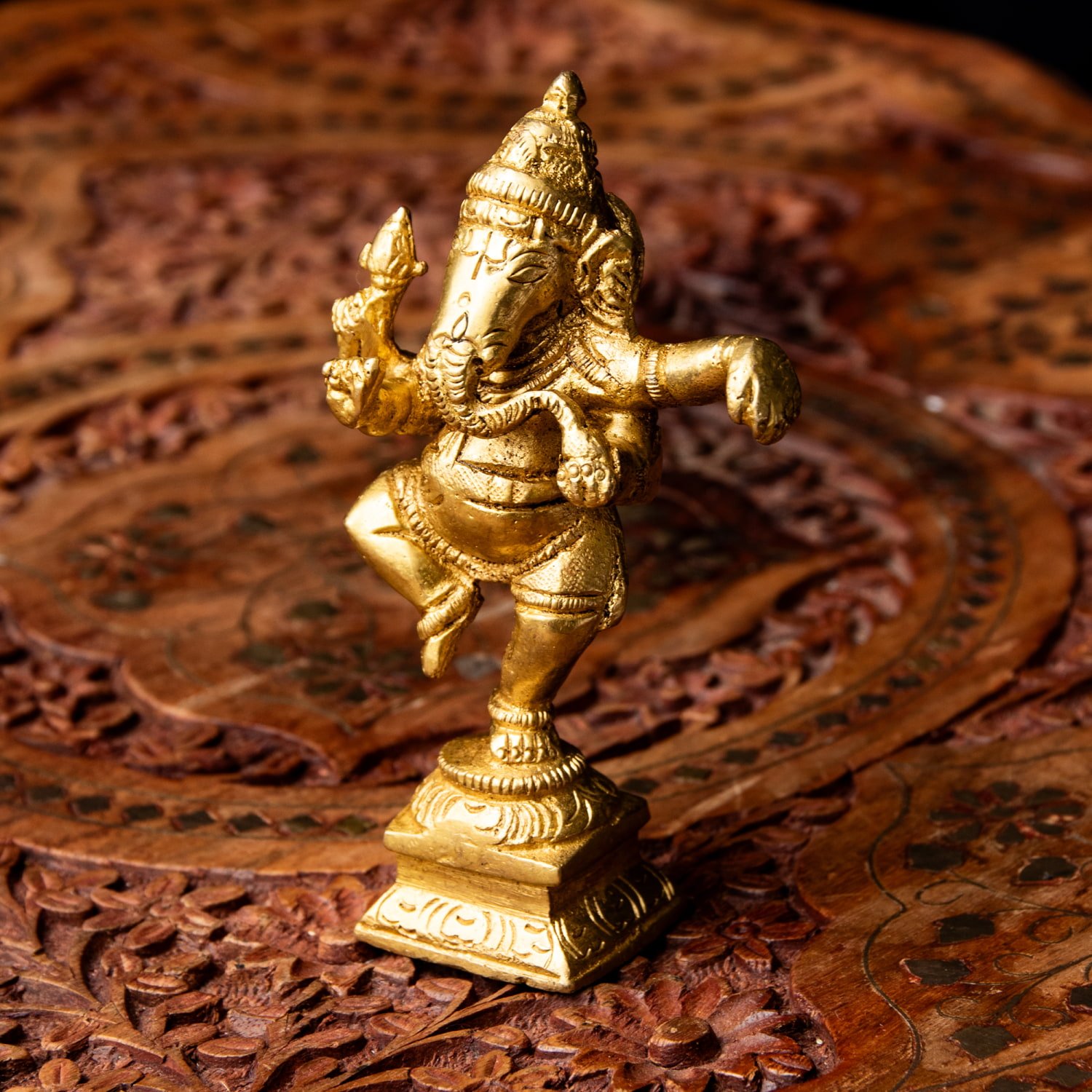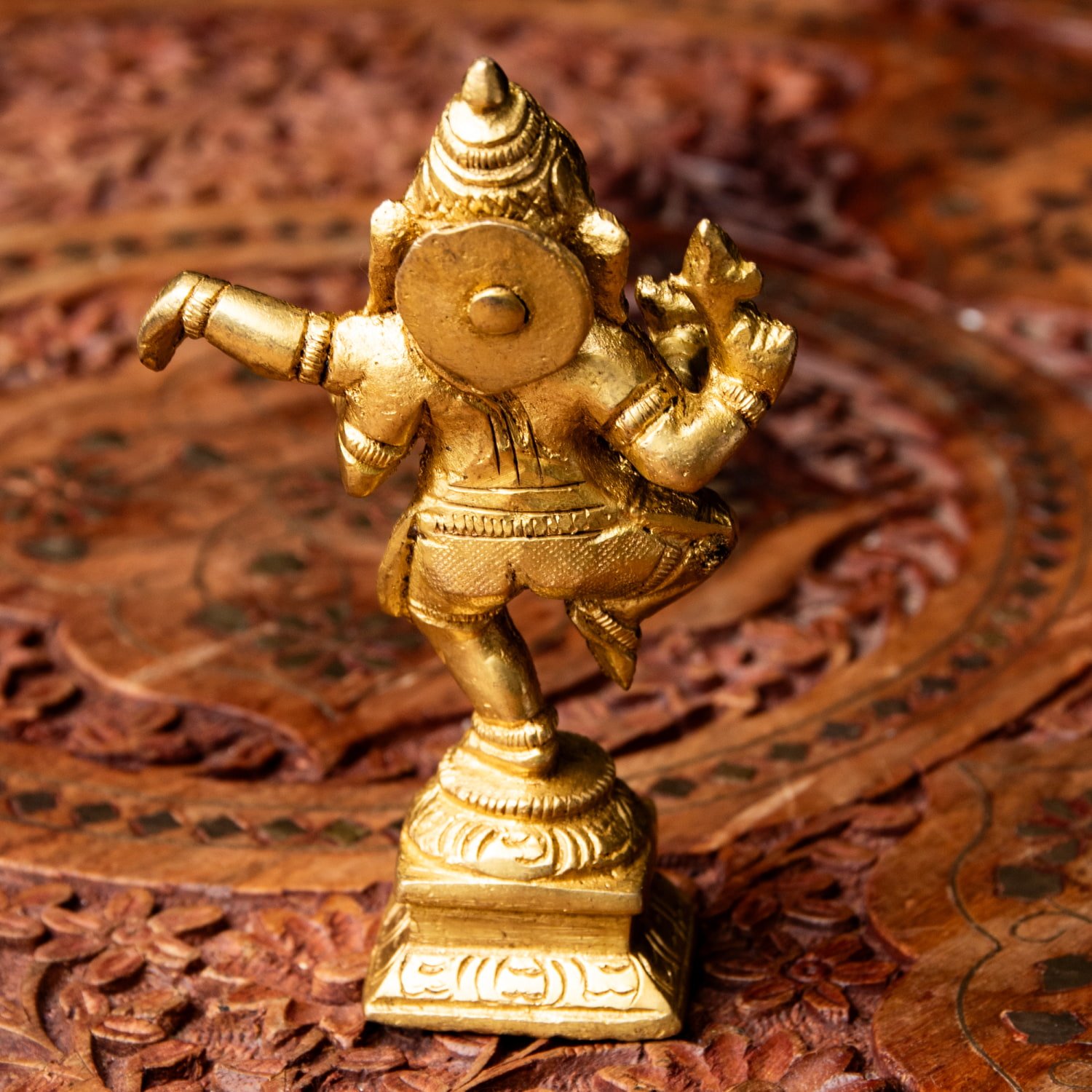 楽器を奏でたり、踊ったり、本を読んだり書いたり、時にはリラックスして寝転がっていたり…多彩なお姿からはその人気ぶりが伺えます。世界一長い物語とも言われるインドの叙事詩『マハーバーラタ』を筆記したのもガネーシャ神だと語られます。音楽や踊りの舞台では、プログラムの最初にガネーシャに祈りを捧げる習慣があります。あらゆる障害を破壊し、願い事の成就へと導いて下さるガネーシャ神は、学問から商売繁盛まで幅広い分野のご利益で信仰され、インドのみならずタイなどの東南アジアでも人気を誇っているのです。| 素材 | ブラス |