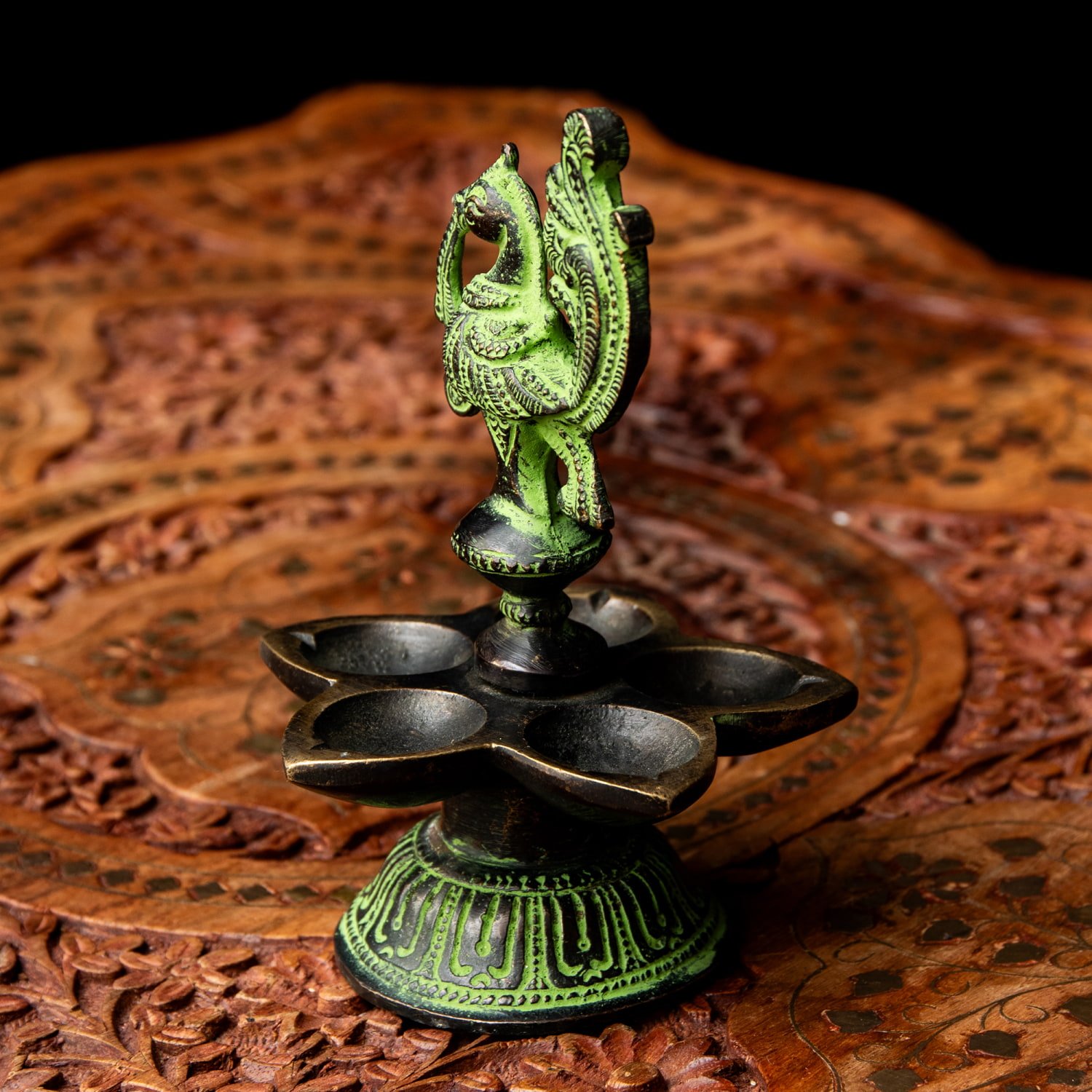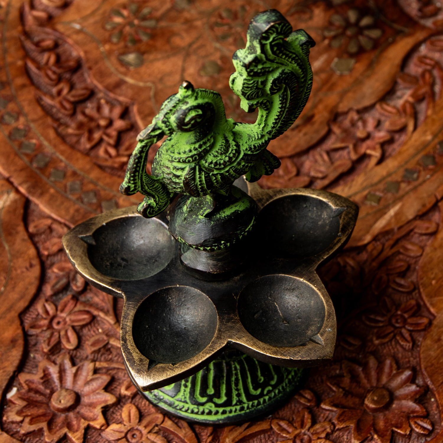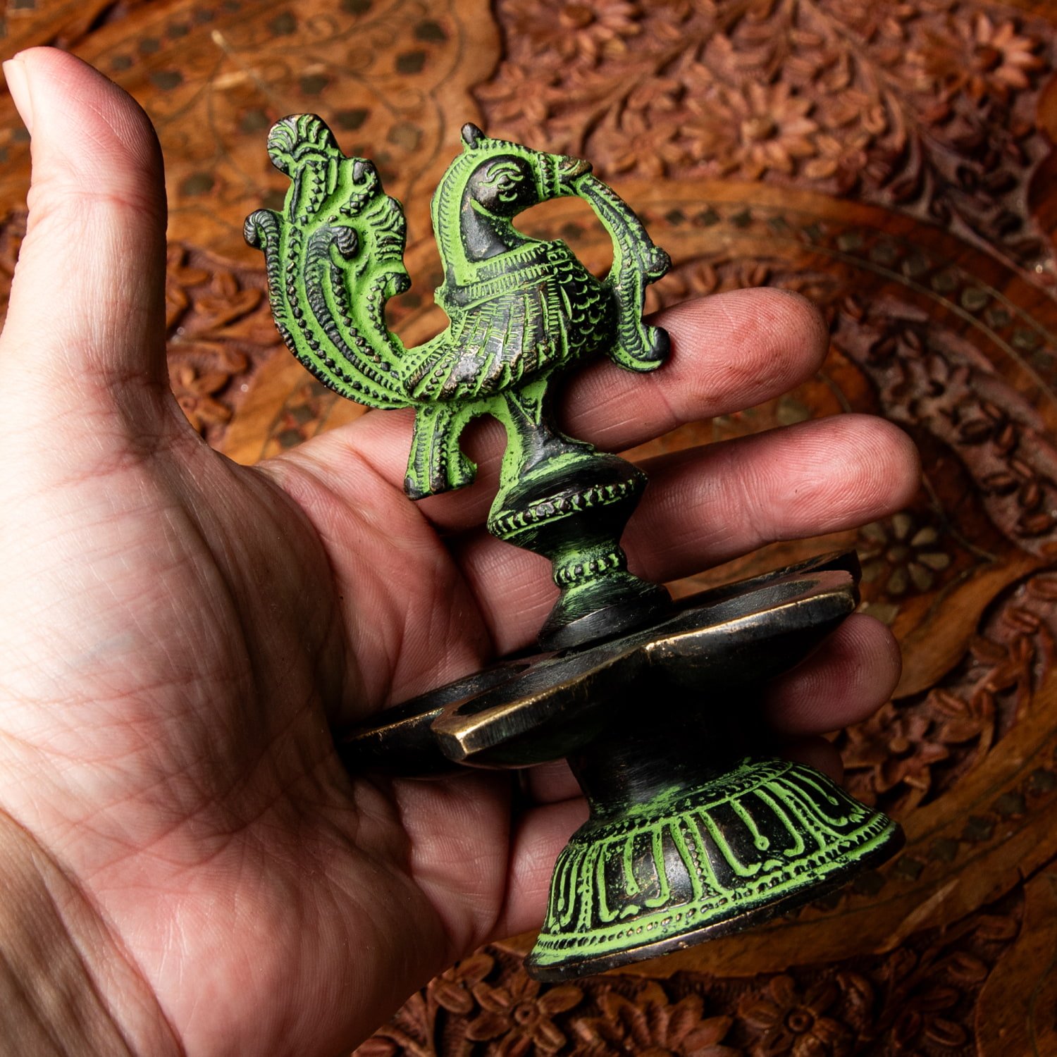 インドの伝統を感じさせる、孔雀モチーフのブラス・オイルランプです。重厚な輝きを放つどっしりとした存在感が光りますね。トップには優雅な孔雀がデザインされ、古代神話に登場する神鳥「マユール(Mayura)」を思わせる気品ある佇まい。細部まで彫り込まれた装飾が美しく、緑青のようなアンティーク加工が施されています。花びらのような形をした受け皿にはオイルやキャンドルを灯すことができ、祭壇の照明としてはもちろん、インテリアオブジェとしても存在感抜群です。金属のずっしりとした重みと、ハンドクラフトならではの温もりを感じさせる逸品です。