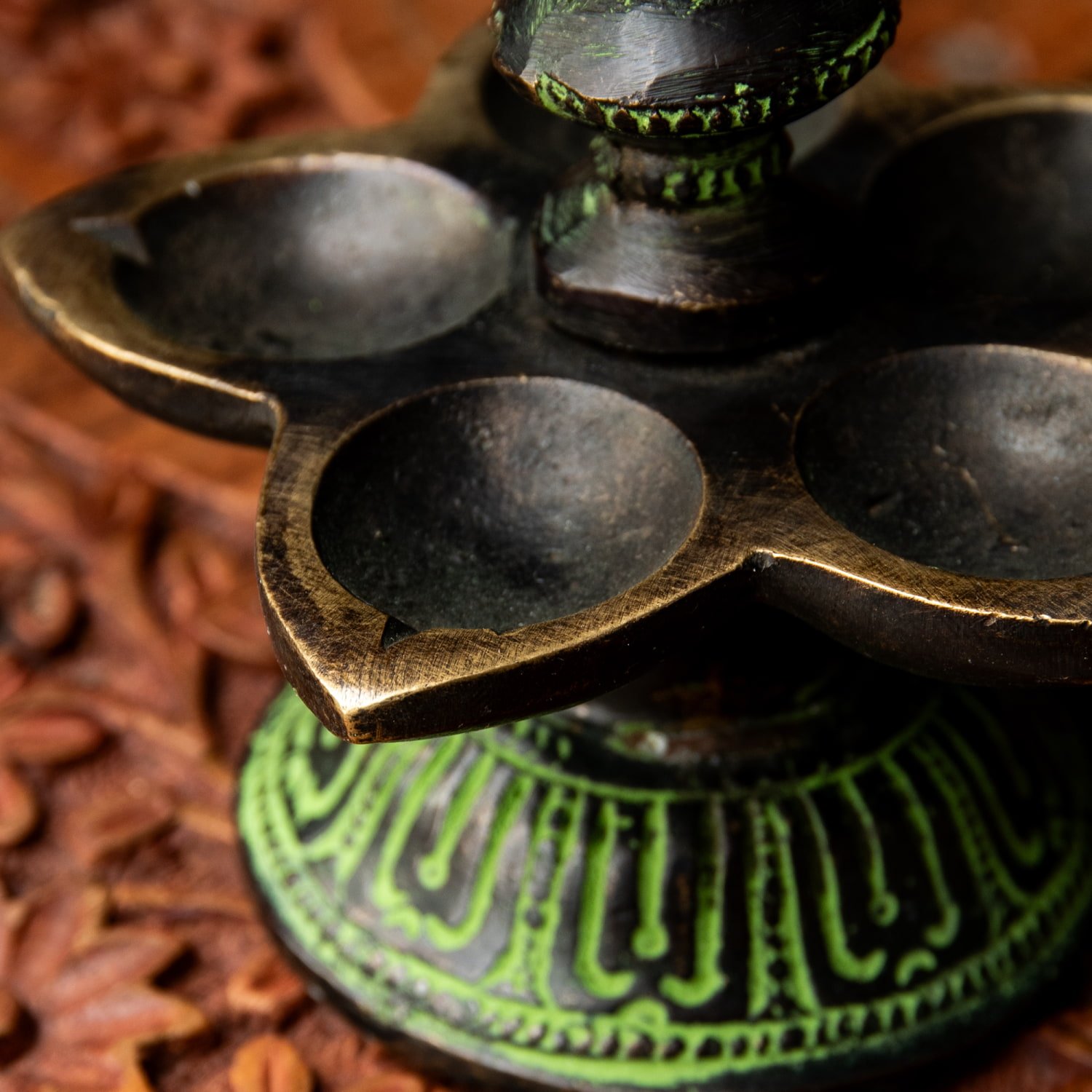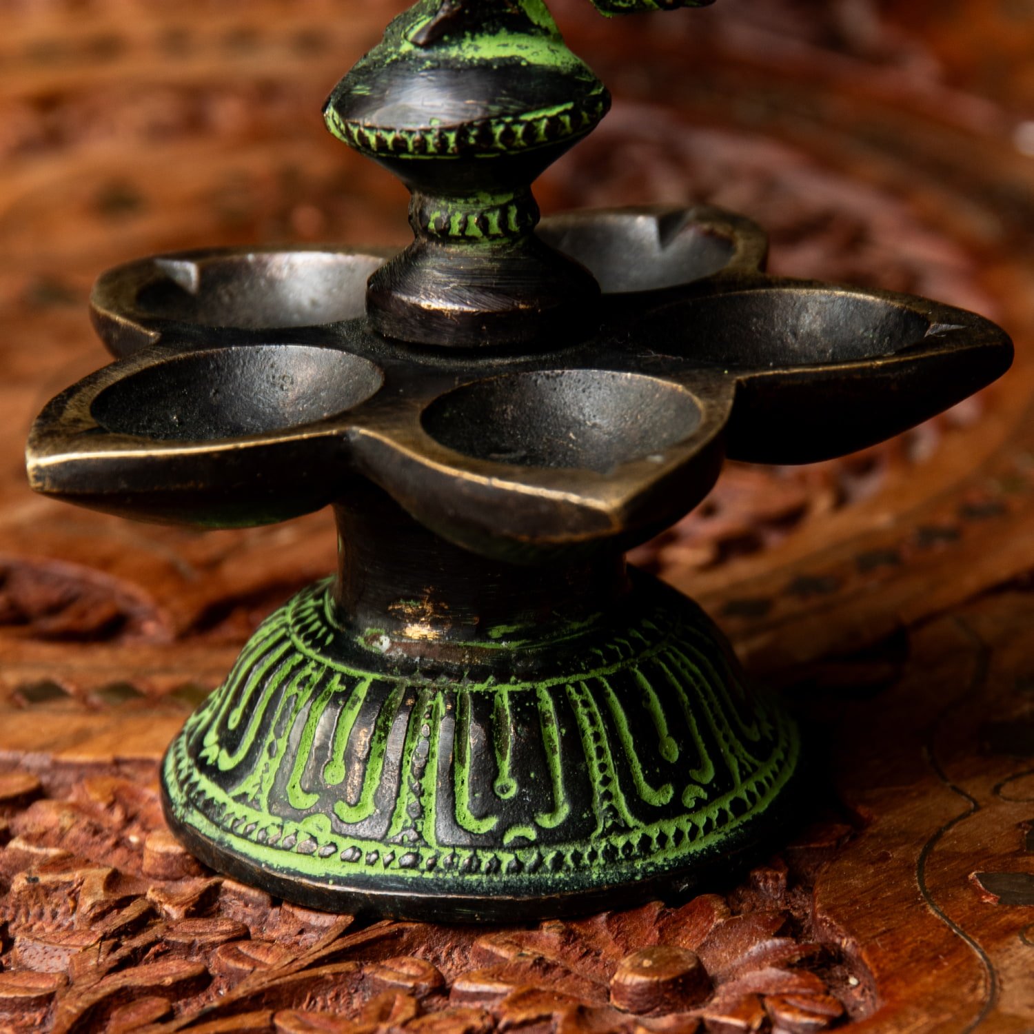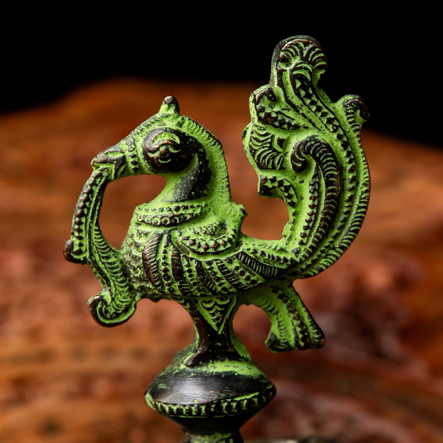 インドの伝統を感じさせる、孔雀モチーフのブラス・オイルランプです。重厚な輝きを放つどっしりとした存在感が光りますね。トップには優雅な孔雀がデザインされ、古代神話に登場する神鳥「マユール(Mayura)」を思わせる気品ある佇まい。細部まで彫り込まれた装飾が美しく、緑青のようなアンティーク加工が施されています。花びらのような形をした受け皿にはオイルやキャンドルを灯すことができ、祭壇の照明としてはもちろん、インテリアオブジェとしても存在感抜群です。金属のずっしりとした重みと、ハンドクラフトならではの温もりを感じさせる逸品です。
