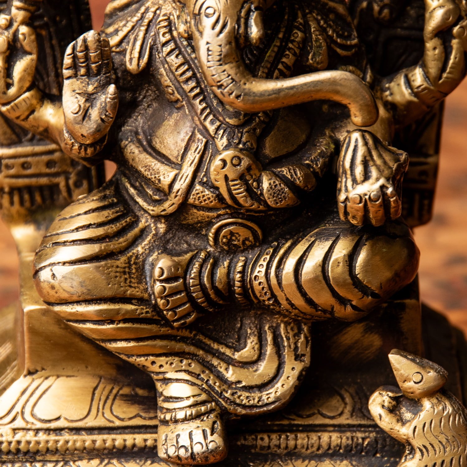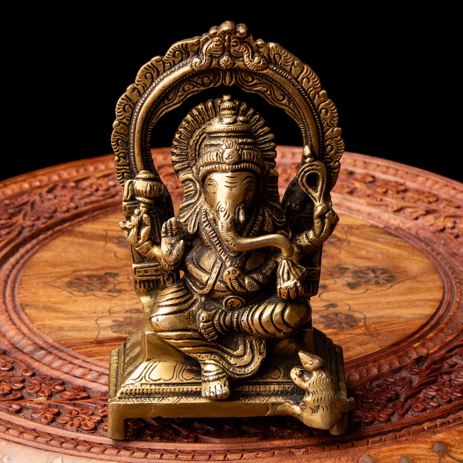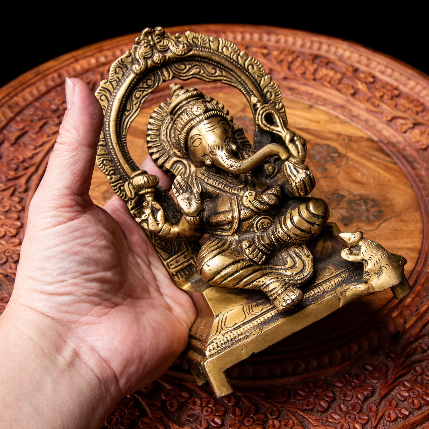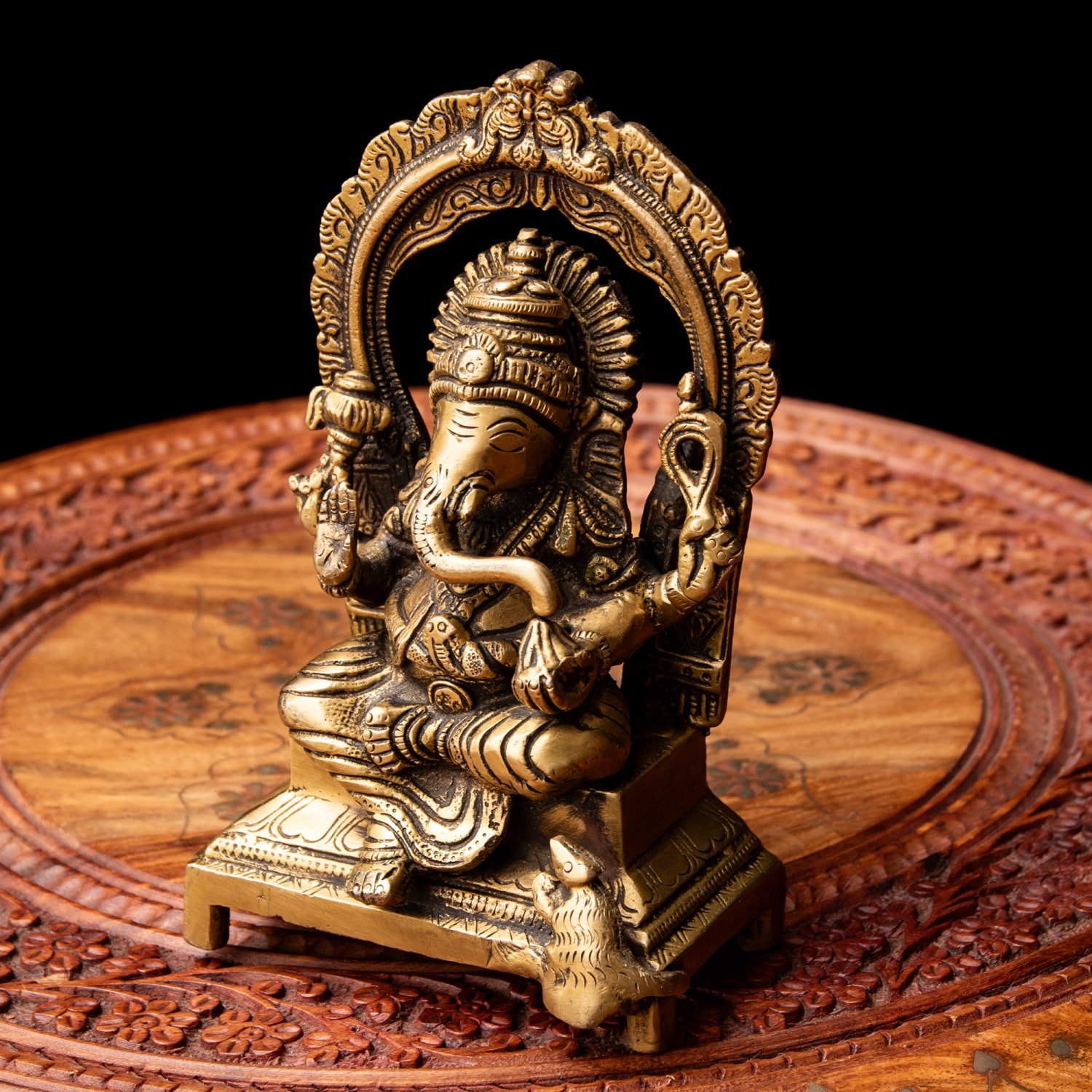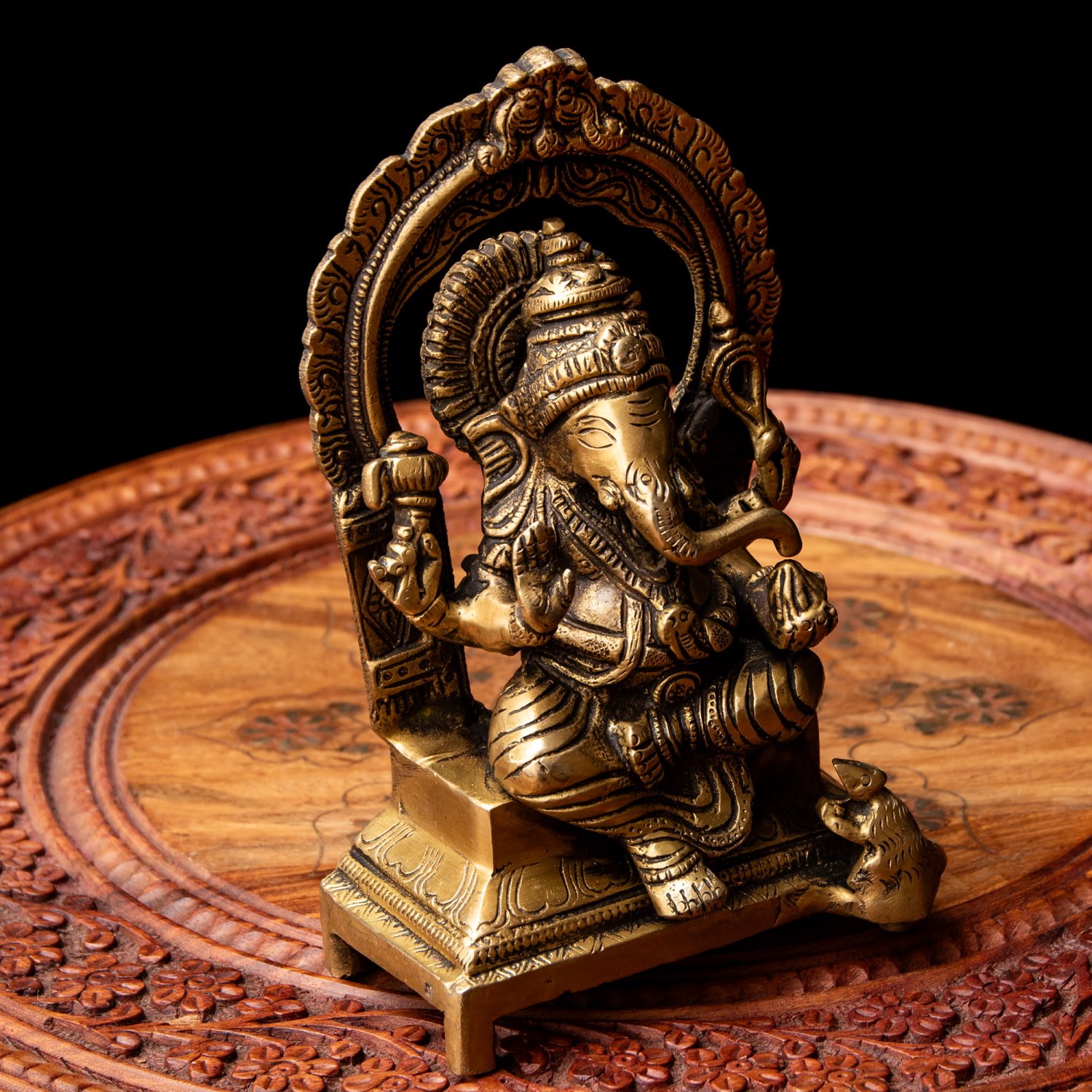 楽器を奏でたり、踊ったり、本を読んだり書いたり、時にはリラックスして寝転がっていたり…多彩なお姿からはその人気ぶりが伺えます。世界一長い物語とも言われるインドの叙事詩『マハーバーラタ』を筆記したのもガネーシャ神だと語られます。音楽や踊りの舞台では、プログラムの最初にガネーシャに祈りを捧げる習慣があります。あらゆる障害を破壊し、願い事の成就へと導いて下さるガネーシャ神は、学問から商売繁盛まで幅広い分野のご利益で信仰され、インドのみならずタイなどの東南アジアでも人気を誇っているのです。| 素材 | ブラス |