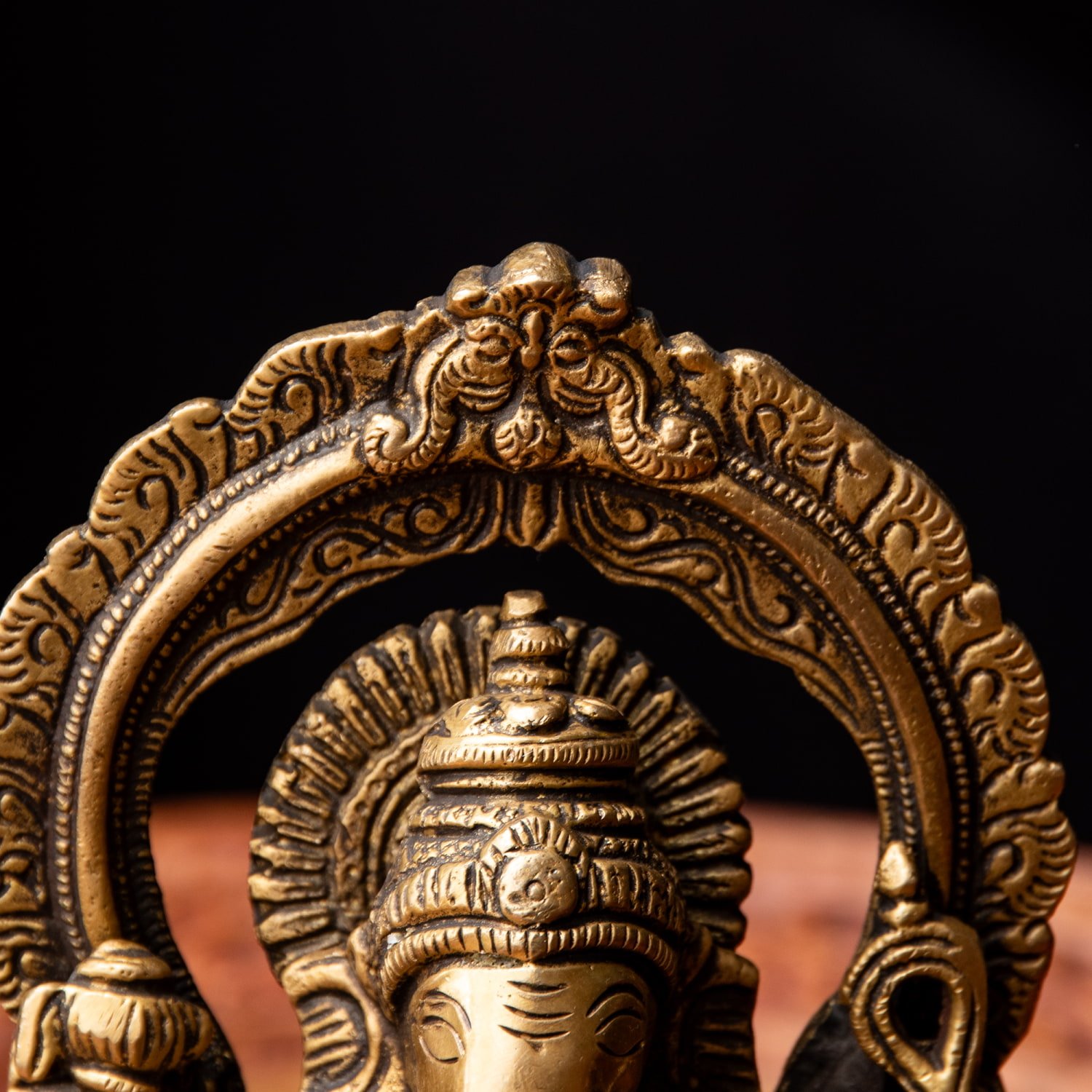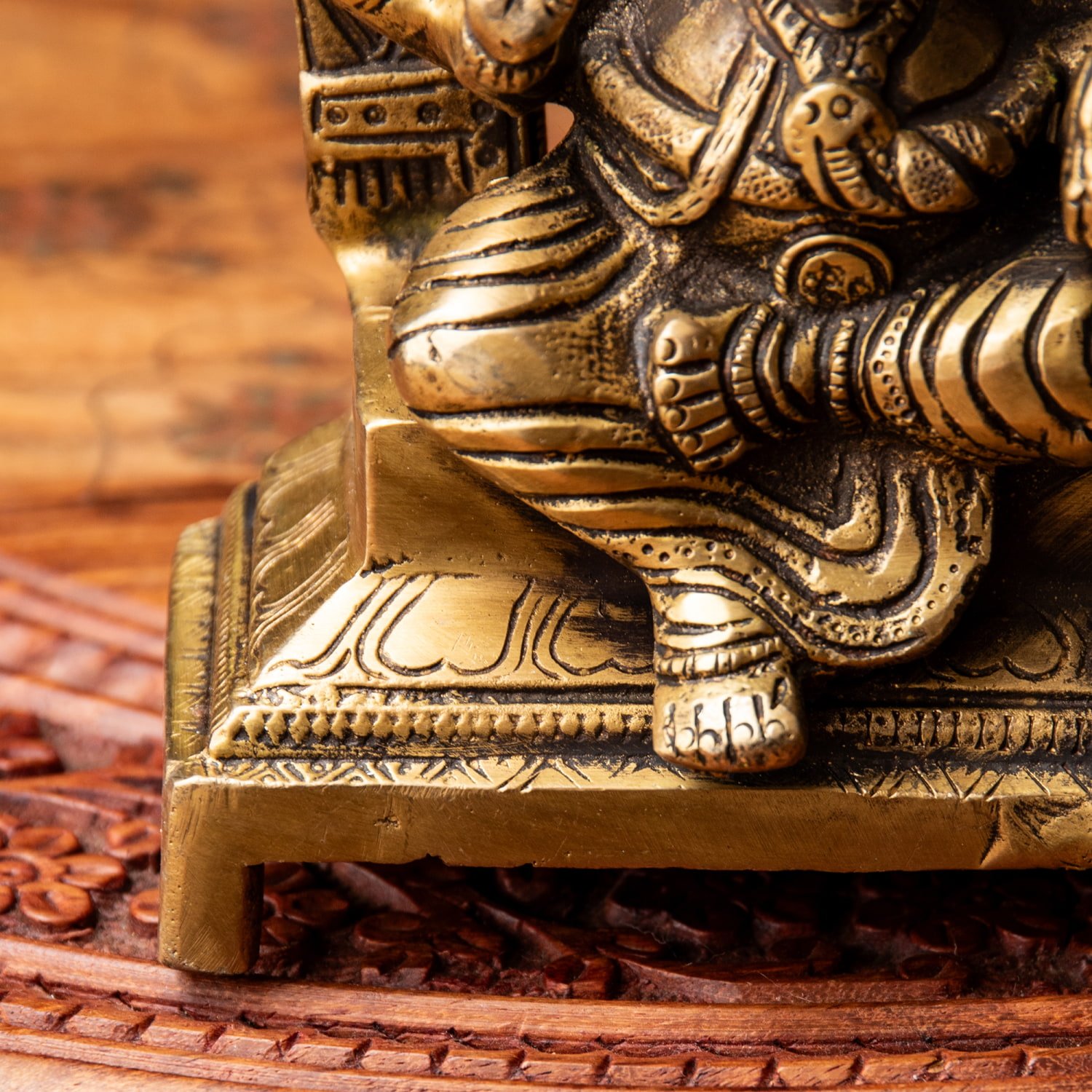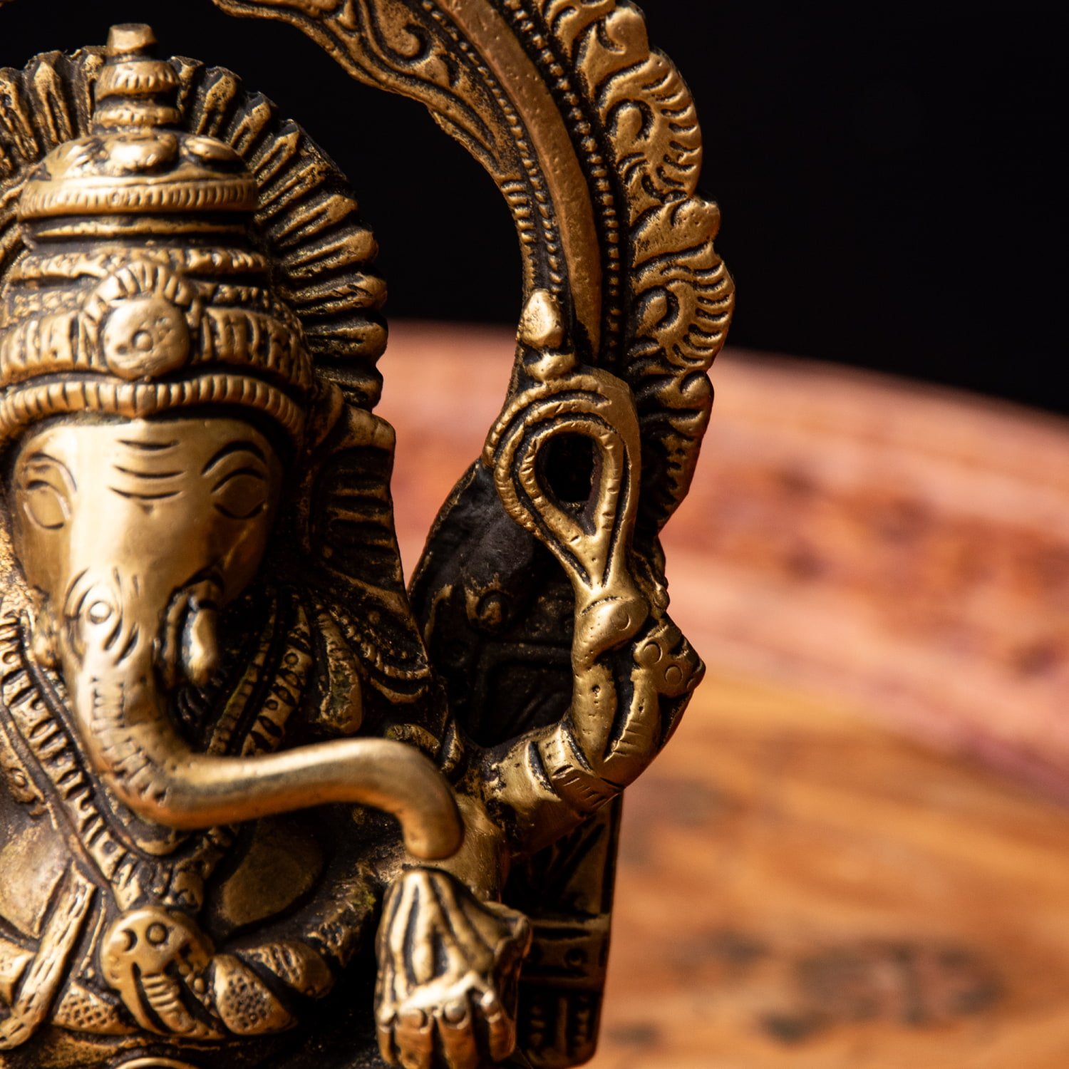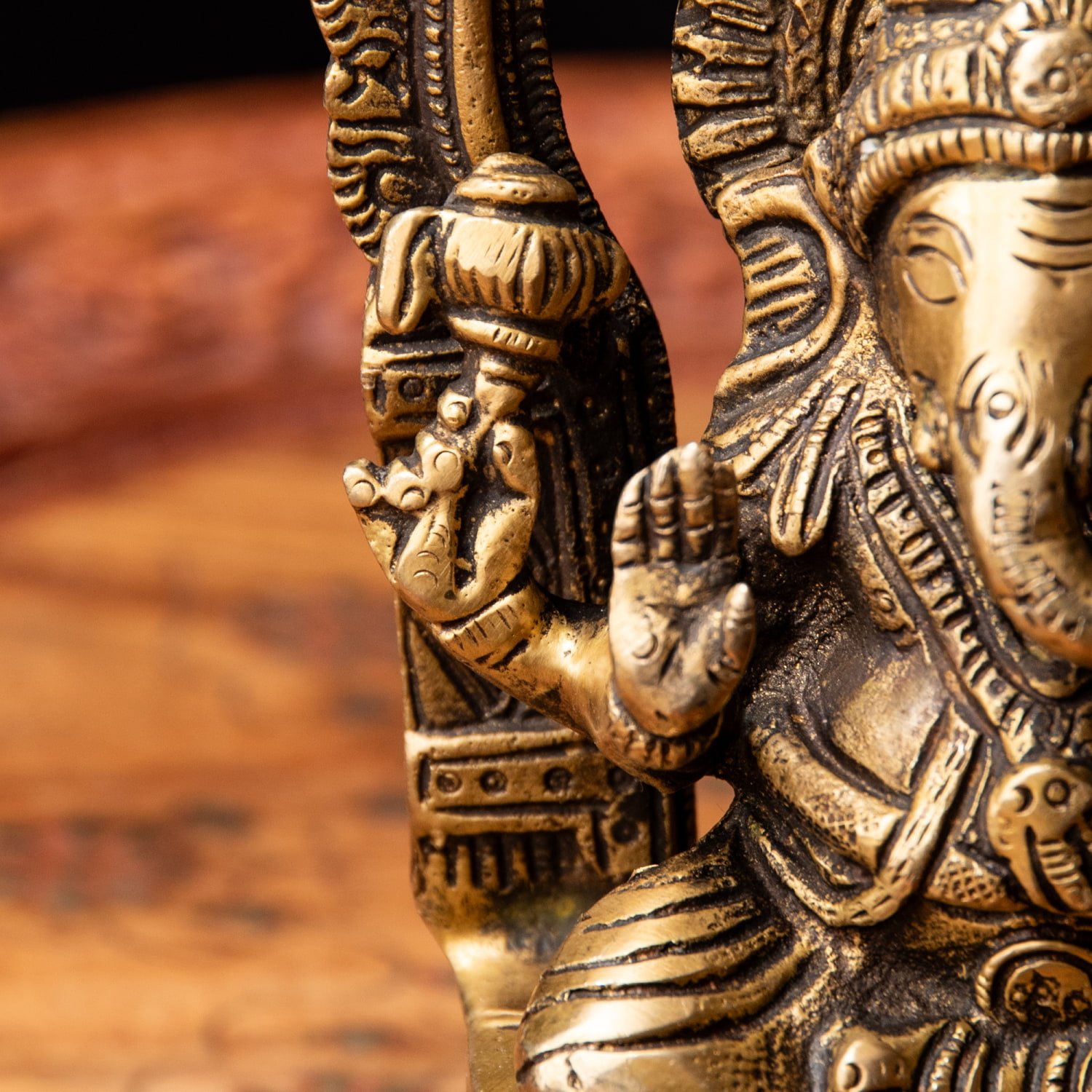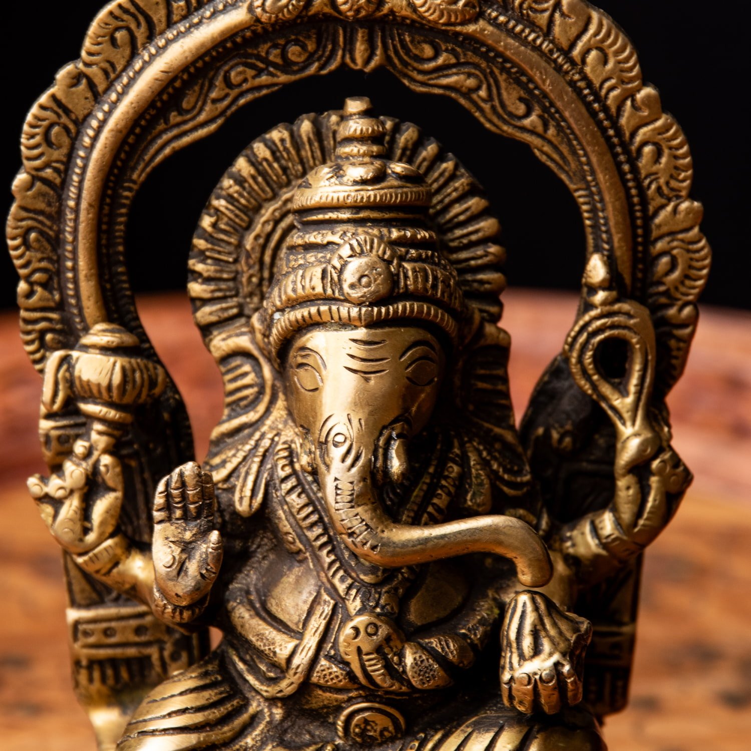 楽器を奏でたり、踊ったり、本を読んだり書いたり、時にはリラックスして寝転がっていたり…多彩なお姿からはその人気ぶりが伺えます。世界一長い物語とも言われるインドの叙事詩『マハーバーラタ』を筆記したのもガネーシャ神だと語られます。音楽や踊りの舞台では、プログラムの最初にガネーシャに祈りを捧げる習慣があります。あらゆる障害を破壊し、願い事の成就へと導いて下さるガネーシャ神は、学問から商売繁盛まで幅広い分野のご利益で信仰され、インドのみならずタイなどの東南アジアでも人気を誇っているのです。| 素材 | ブラス |