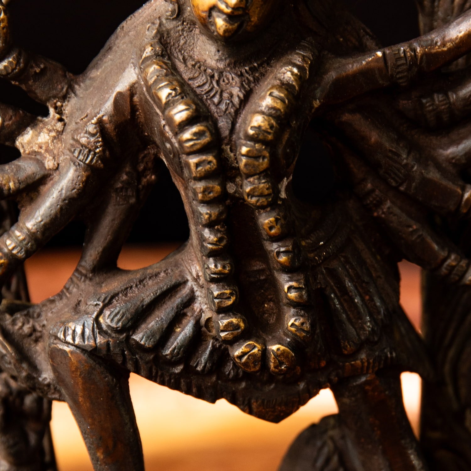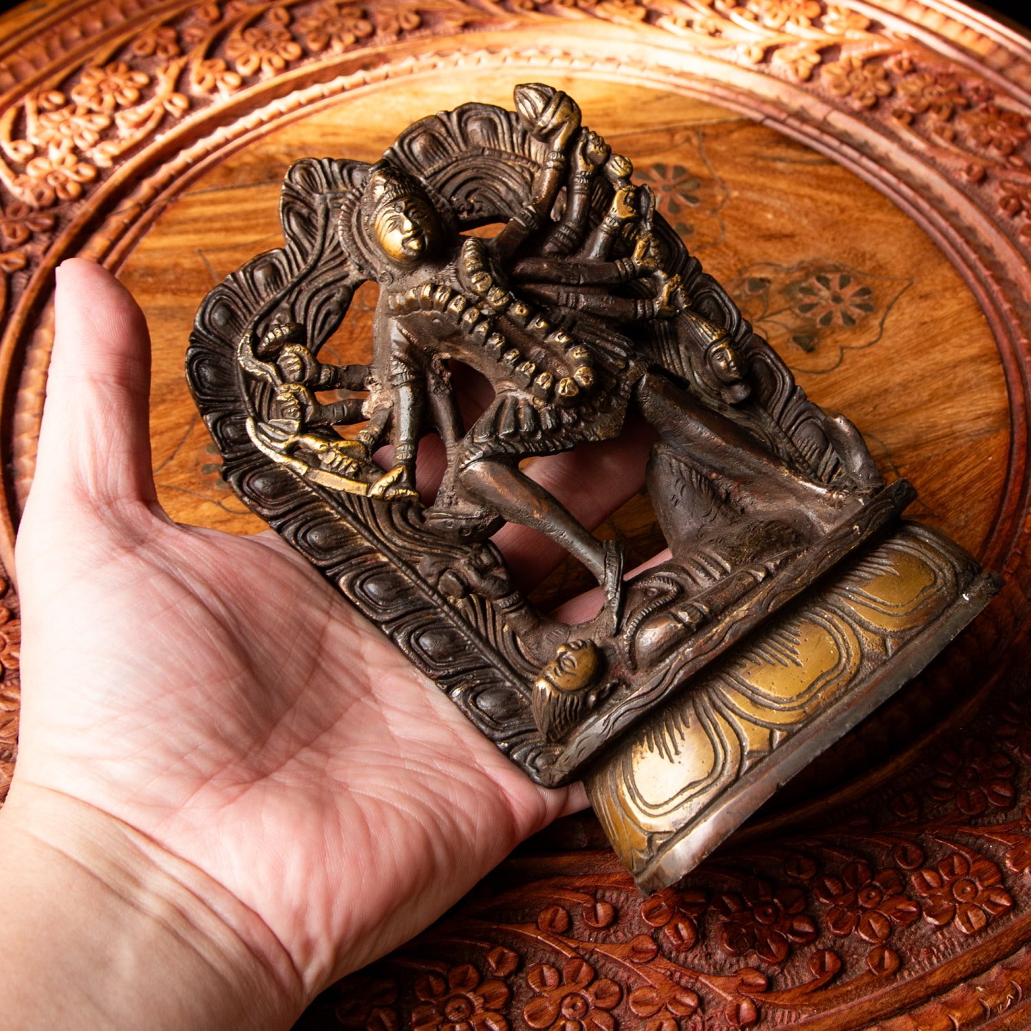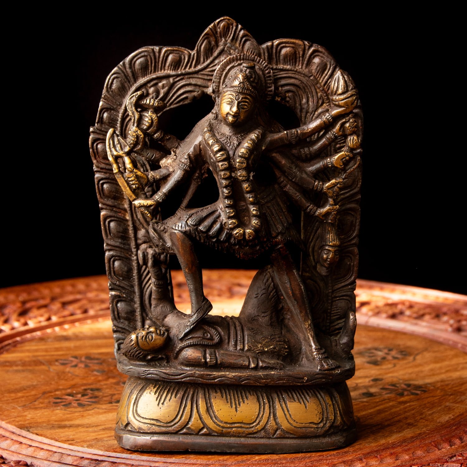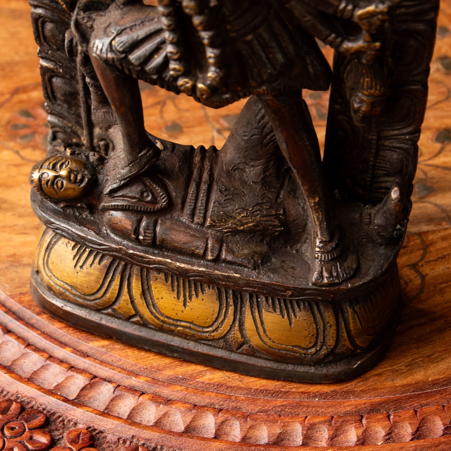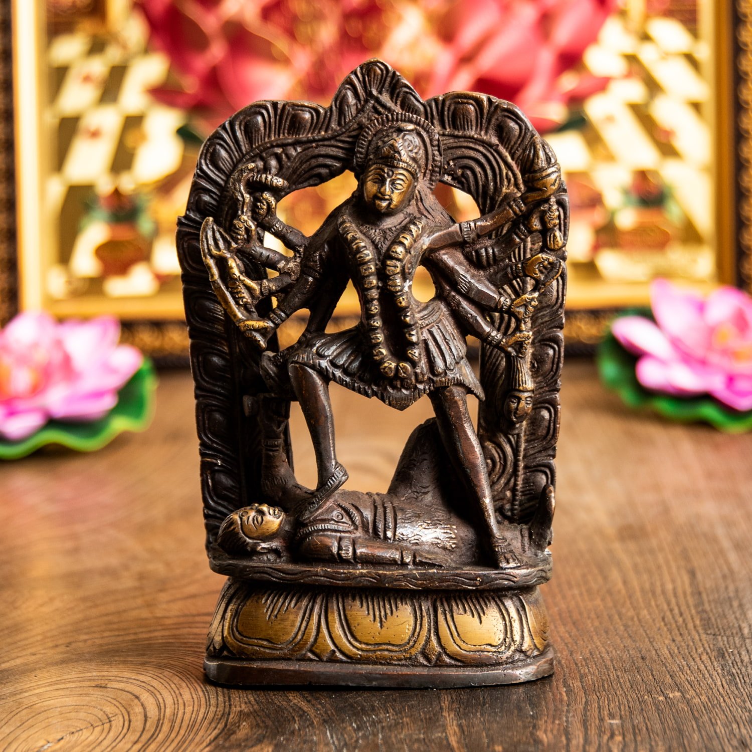 髑髏のネックレスに人間の腕と連ねた腰蓑を身に着け、無数の武器を携えた恐ろしげな姿のカーリーは、シヴァ神の妃パールヴァティーの化身のうち最も激しい怒りの姿であるとされます。舌をベロリと出して髪を振り乱し、シヴァ神の体を踏みつけながら破壊のダンスを踊ります。その名は肌の色にちなんで「黒」を意味するとも、或いは破壊と再生を司ることから「時」、すなわち生死の境を超越した「永遠の存在」を意味するとも言われています。■耐久性抜群のブラス製