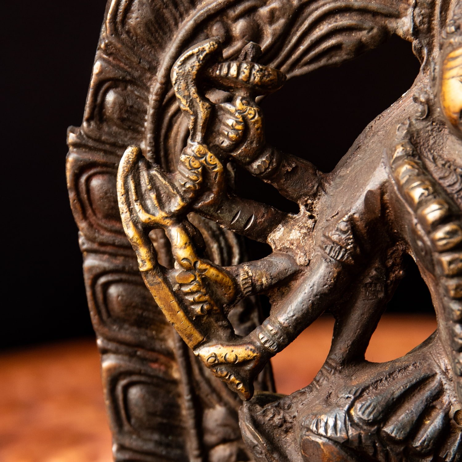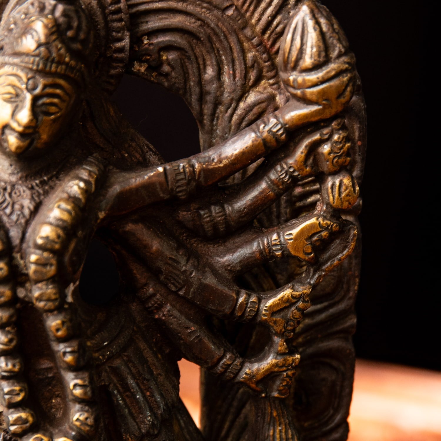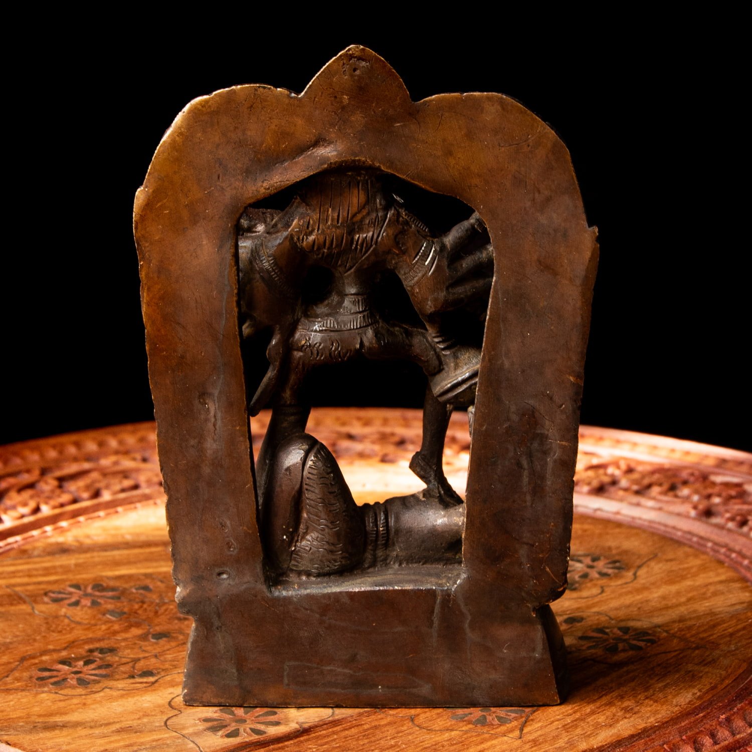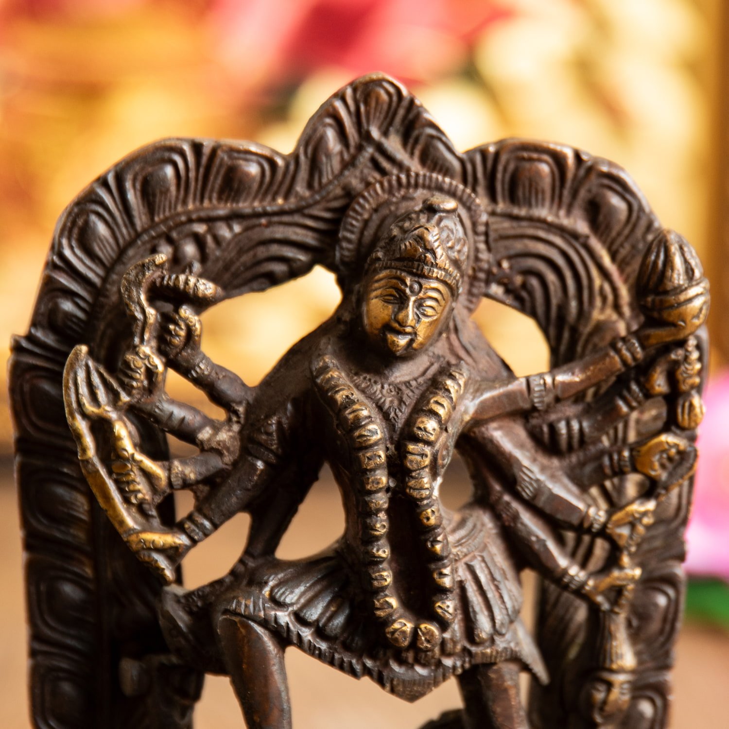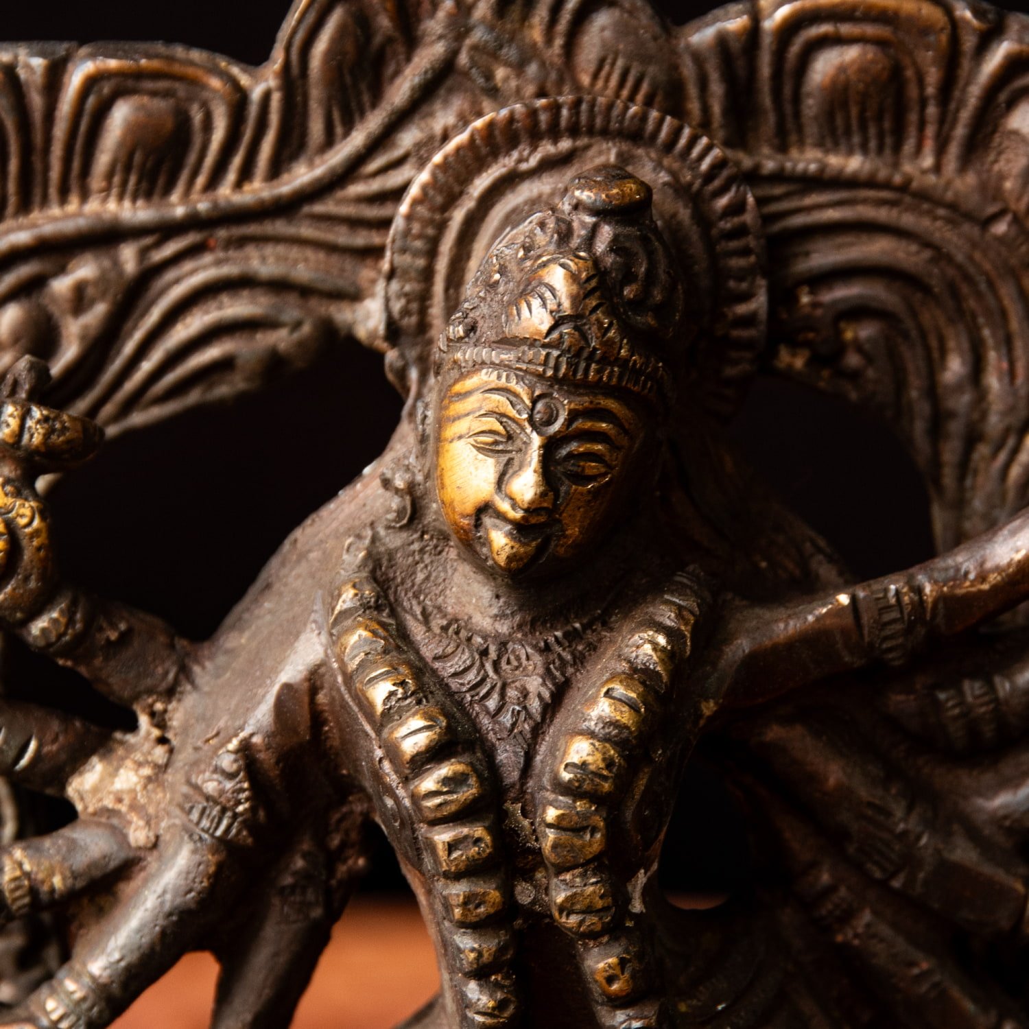 髑髏のネックレスに人間の腕と連ねた腰蓑を身に着け、無数の武器を携えた恐ろしげな姿のカーリーは、シヴァ神の妃パールヴァティーの化身のうち最も激しい怒りの姿であるとされます。舌をベロリと出して髪を振り乱し、シヴァ神の体を踏みつけながら破壊のダンスを踊ります。その名は肌の色にちなんで「黒」を意味するとも、或いは破壊と再生を司ることから「時」、すなわち生死の境を超越した「永遠の存在」を意味するとも言われています。■耐久性抜群のブラス製