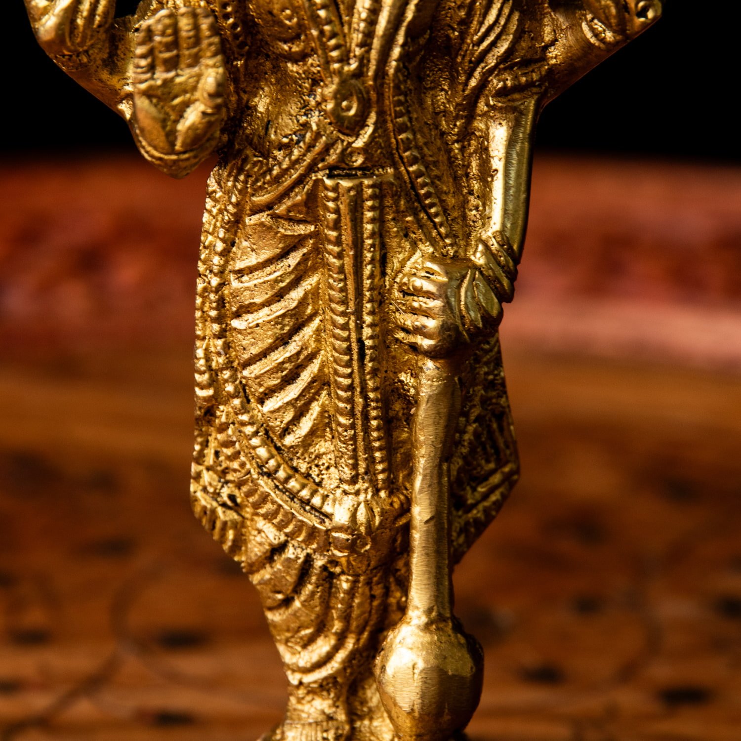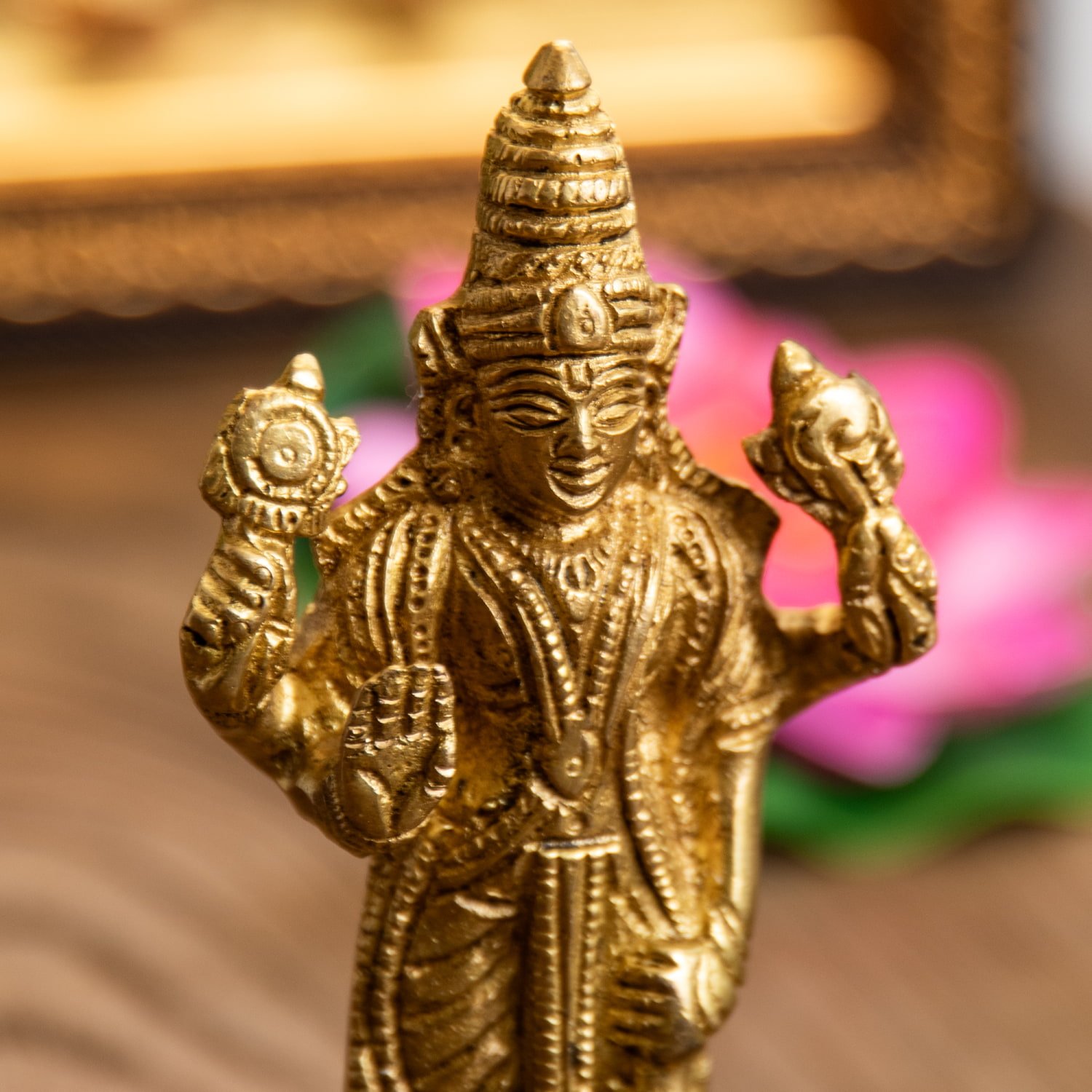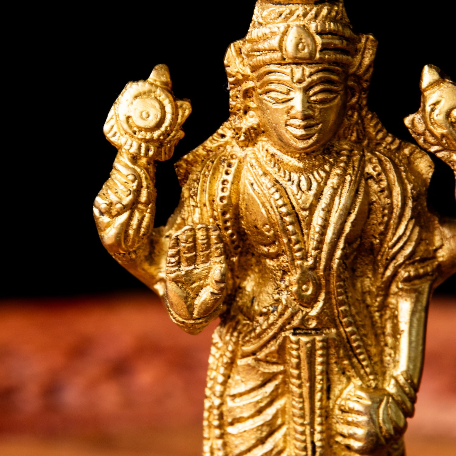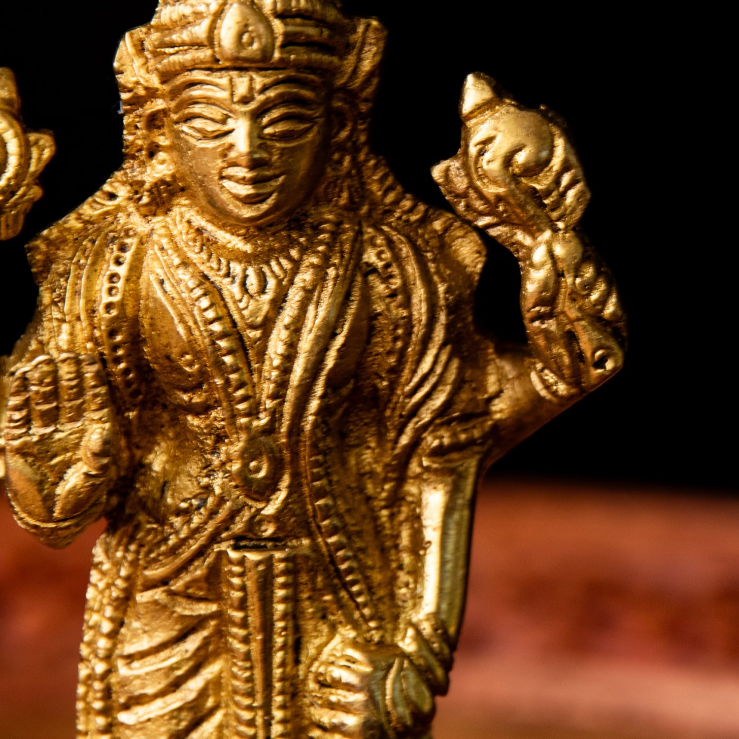 ヒンドゥー教の三大神の一柱であり、特に「保護の神」として信仰されているヴィシュヌ神。宇宙と秩序を維持し、邪悪や混乱が広がると、地上に現れて悪を打ち破るとされています。また、慈愛と寛容の象徴であり、調和と平和を守る役割を担っています。10の化身を持つとされ、それらが地上に降りてさまざまな悪を退ける伝説が伝わっています。有名なアバターには、魚の形のマツヤ、亀の形のクールマ、ラーマ、そしてクリシュナなどの神格までもが含まれます。