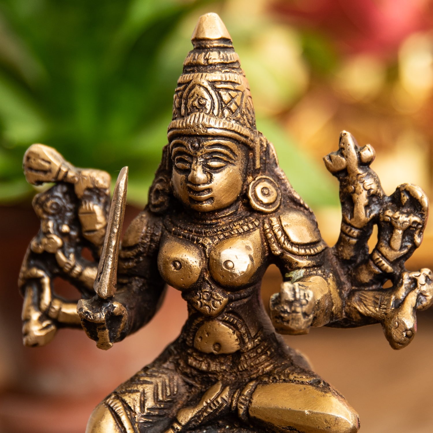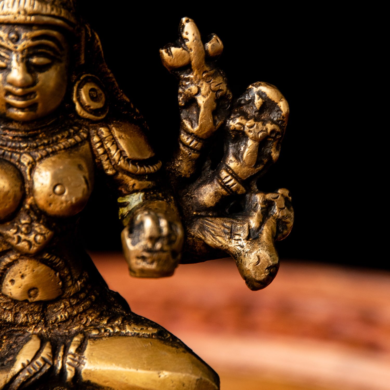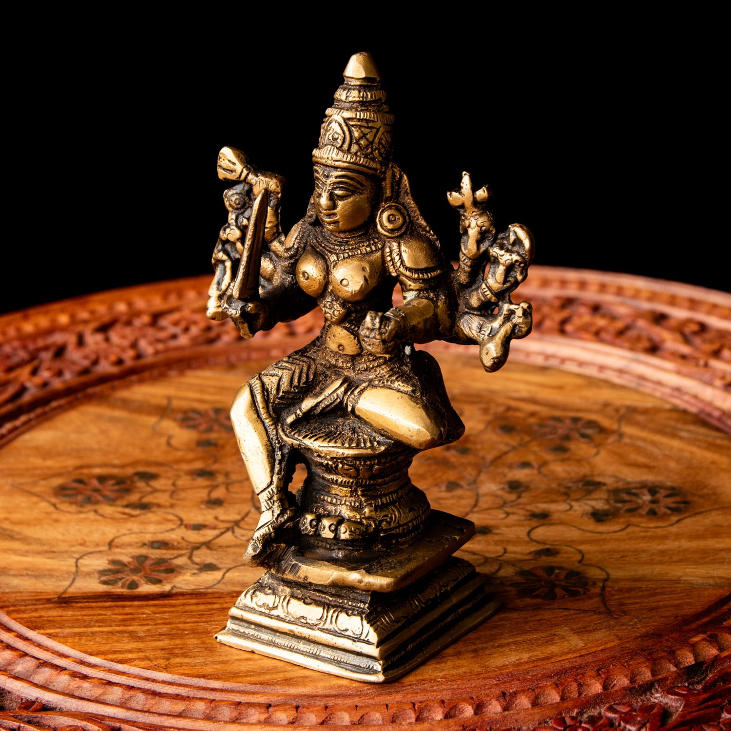 東インドのコルカタは元々女神信仰が篤い地域であり、晩秋にはドゥルガー女神のため盛大にドゥルガー・プージャ祭が祝われます。祭りの時期になると、街の辻ごとに巨大な粘土製のドゥルガー像が建てられ、その出来栄えを競うのだそうです。全部で9日間にも渡るこの祭りの中では、ドゥルガーを含む9女神それぞれに対して日ごとに祈りを捧げます。素材は古来より仏像製作に使われてきたブラス製で、耐久性抜群。10年でも20年でもお使い頂け、年月と共に風合いがよくなります。見て、飾ってきっとご満足いただけると思います。
