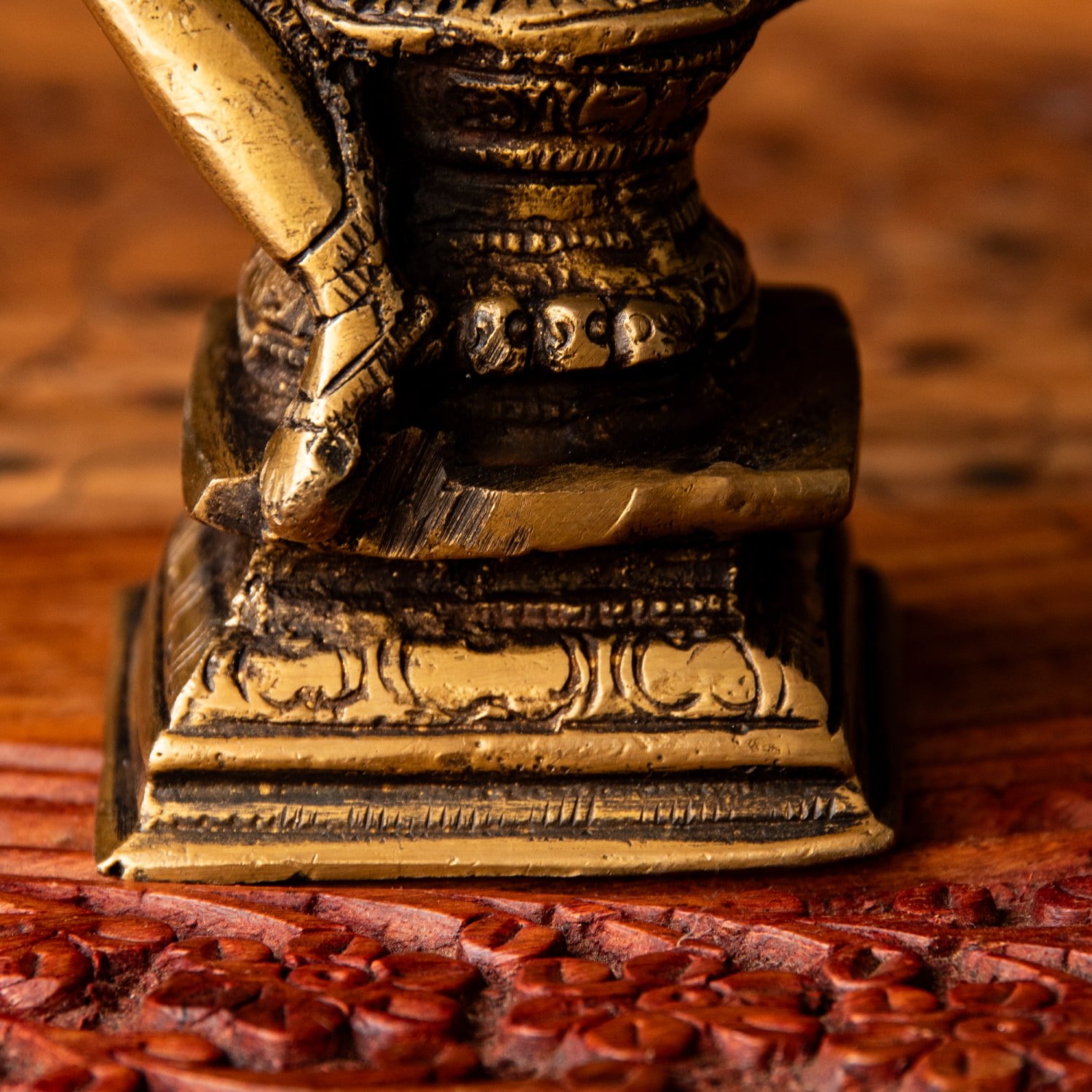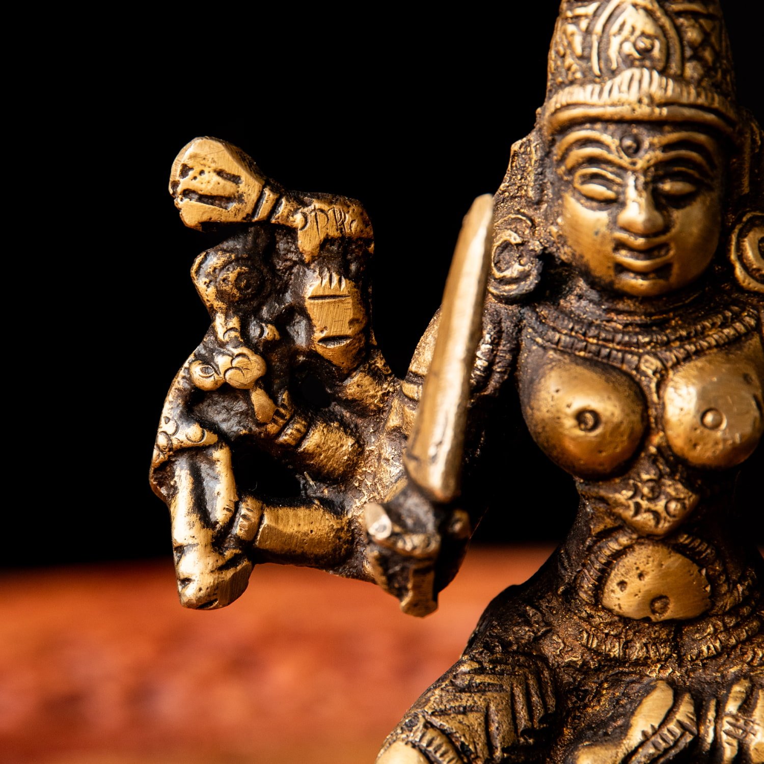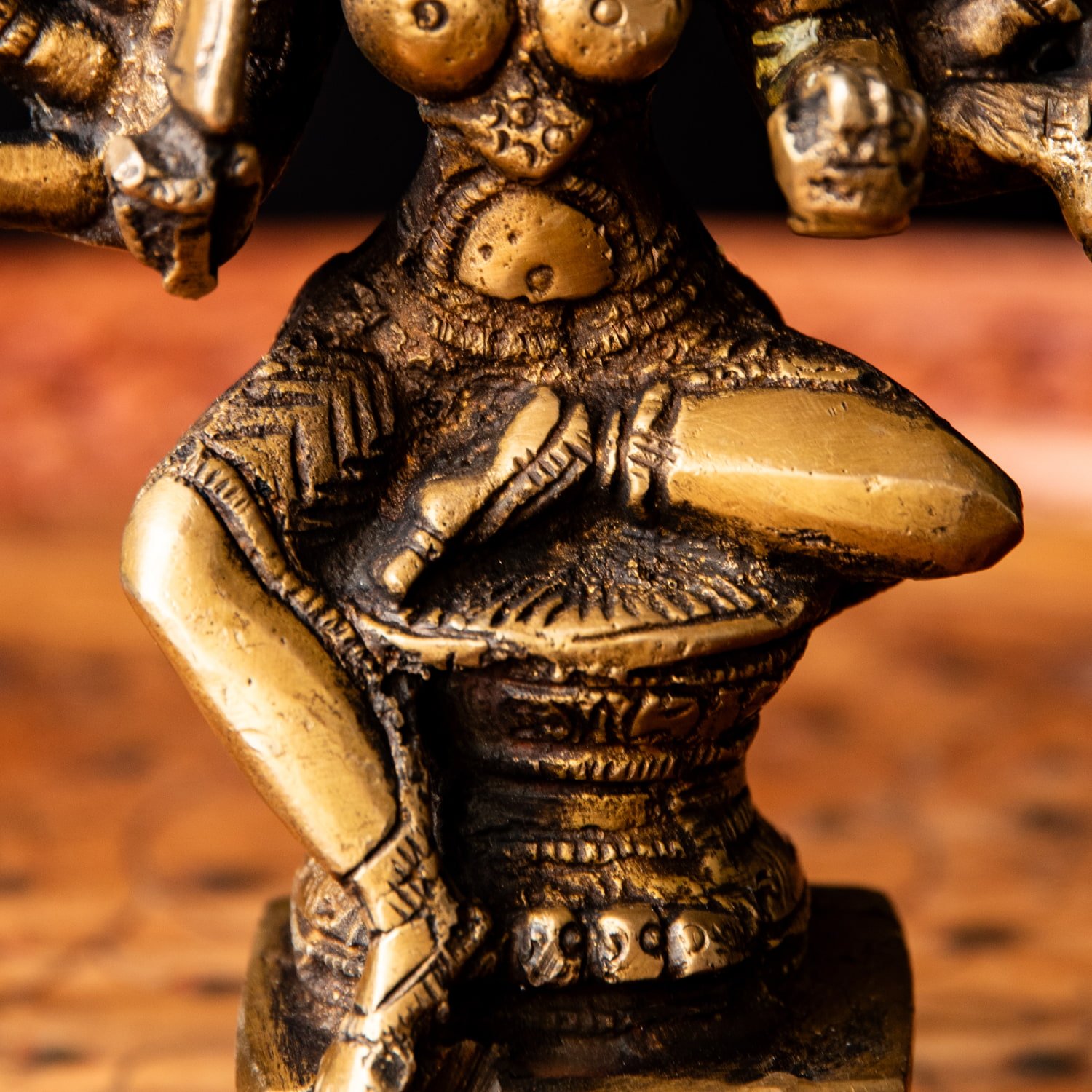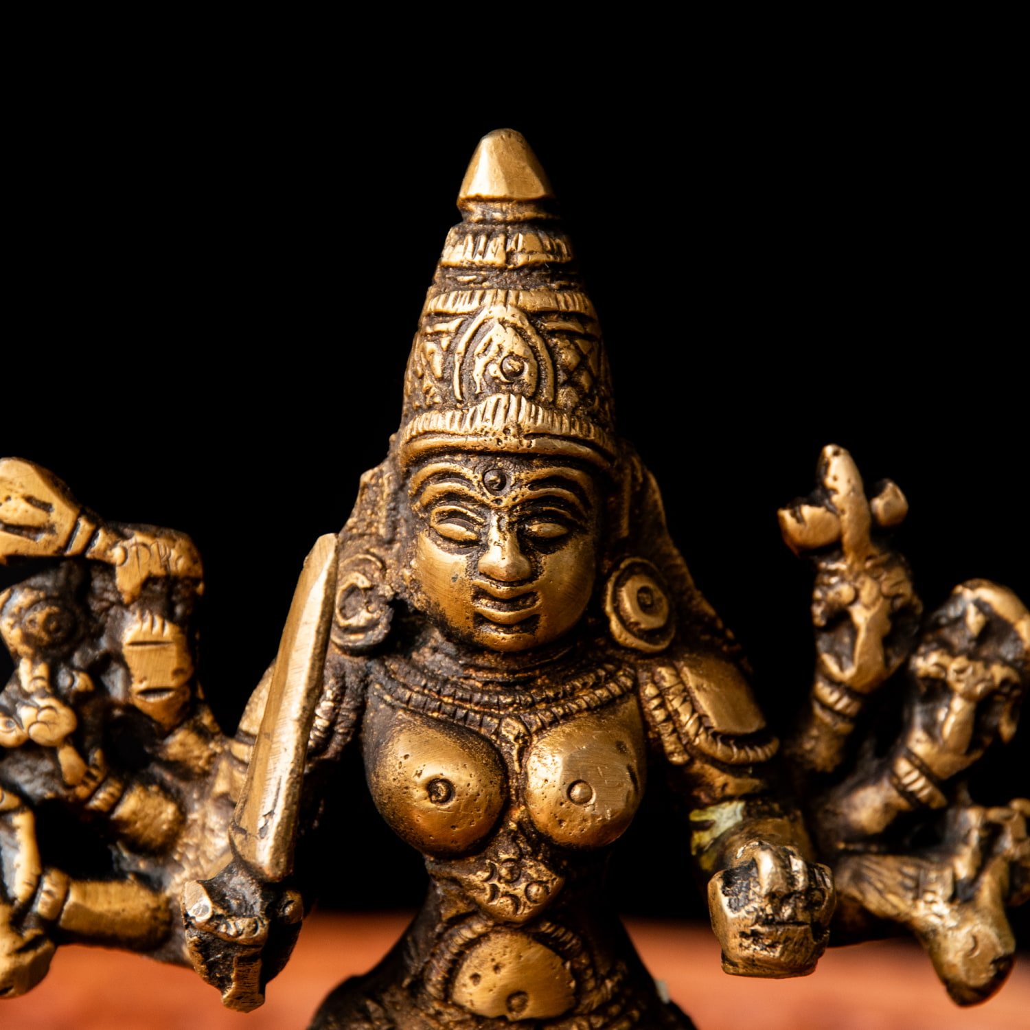 東インドのコルカタは元々女神信仰が篤い地域であり、晩秋にはドゥルガー女神のため盛大にドゥルガー・プージャ祭が祝われます。祭りの時期になると、街の辻ごとに巨大な粘土製のドゥルガー像が建てられ、その出来栄えを競うのだそうです。全部で9日間にも渡るこの祭りの中では、ドゥルガーを含む9女神それぞれに対して日ごとに祈りを捧げます。素材は古来より仏像製作に使われてきたブラス製で、耐久性抜群。10年でも20年でもお使い頂け、年月と共に風合いがよくなります。見て、飾ってきっとご満足いただけると思います。