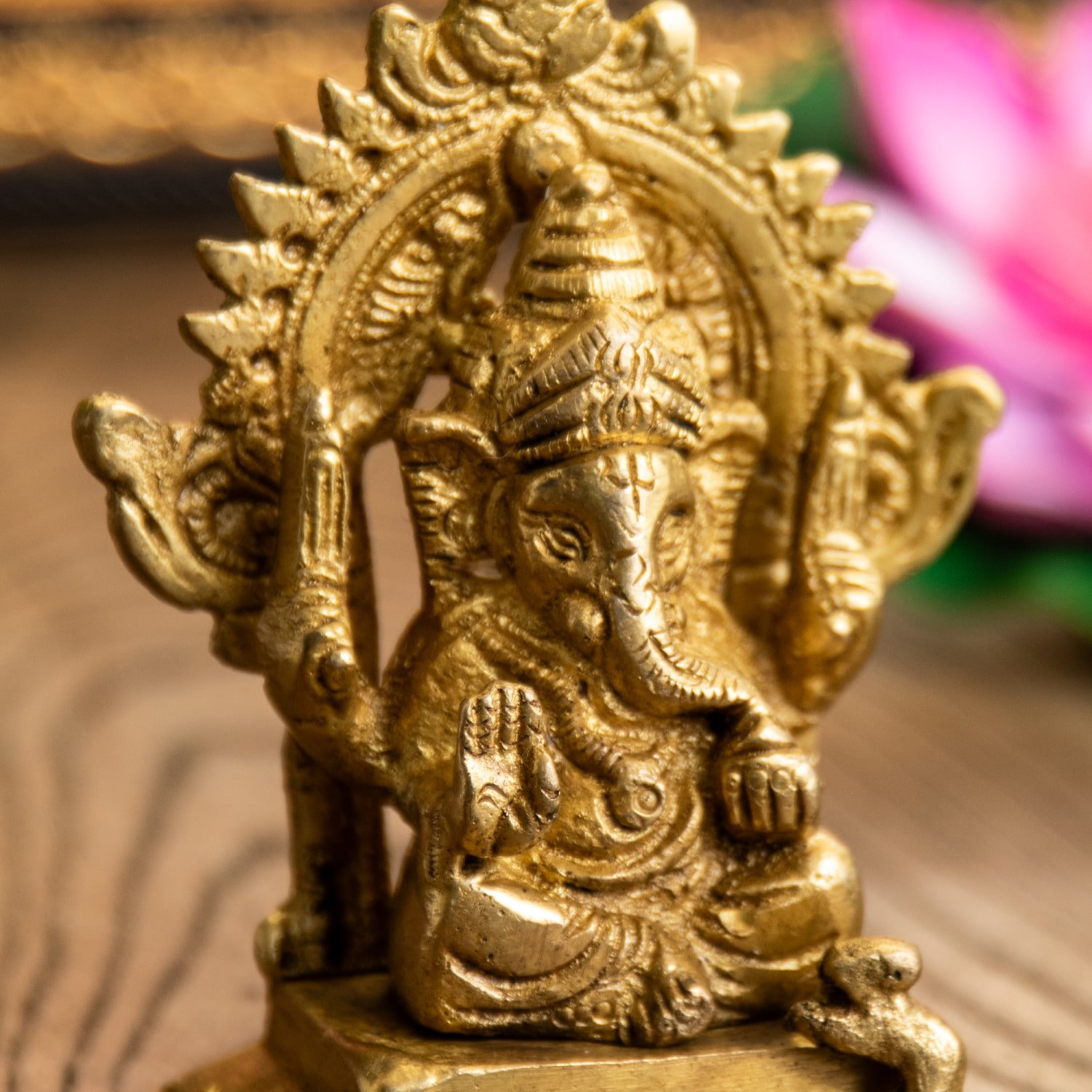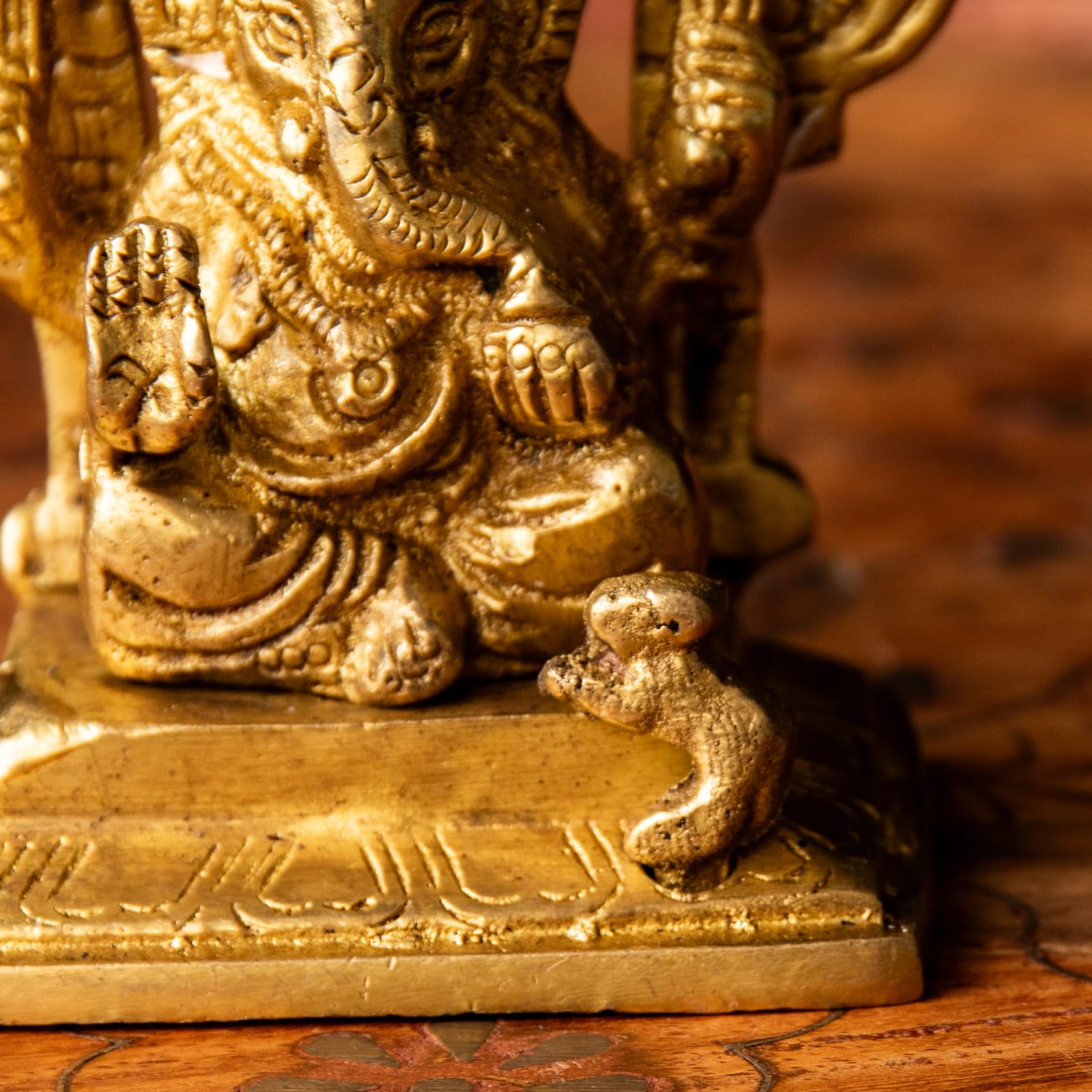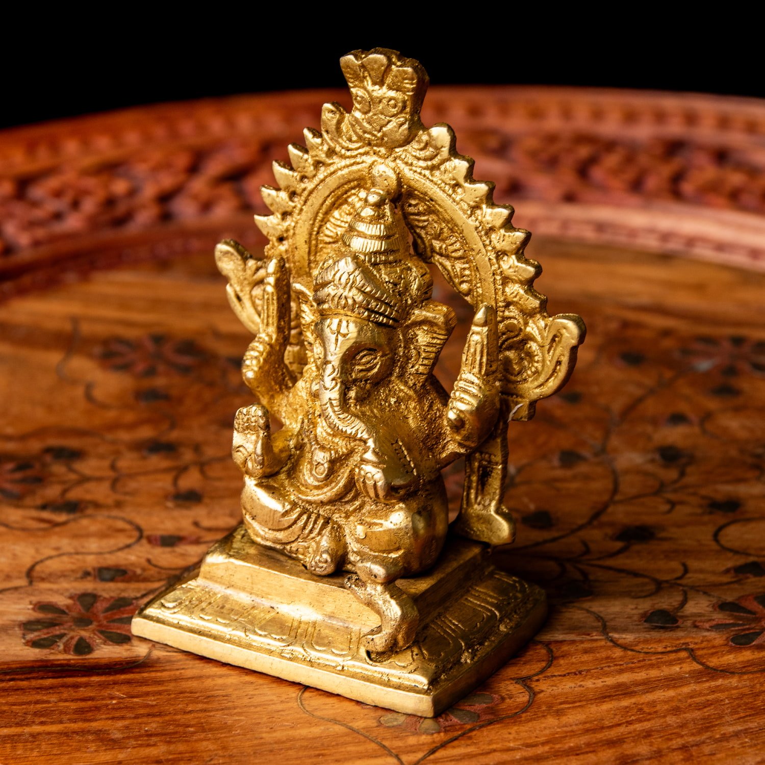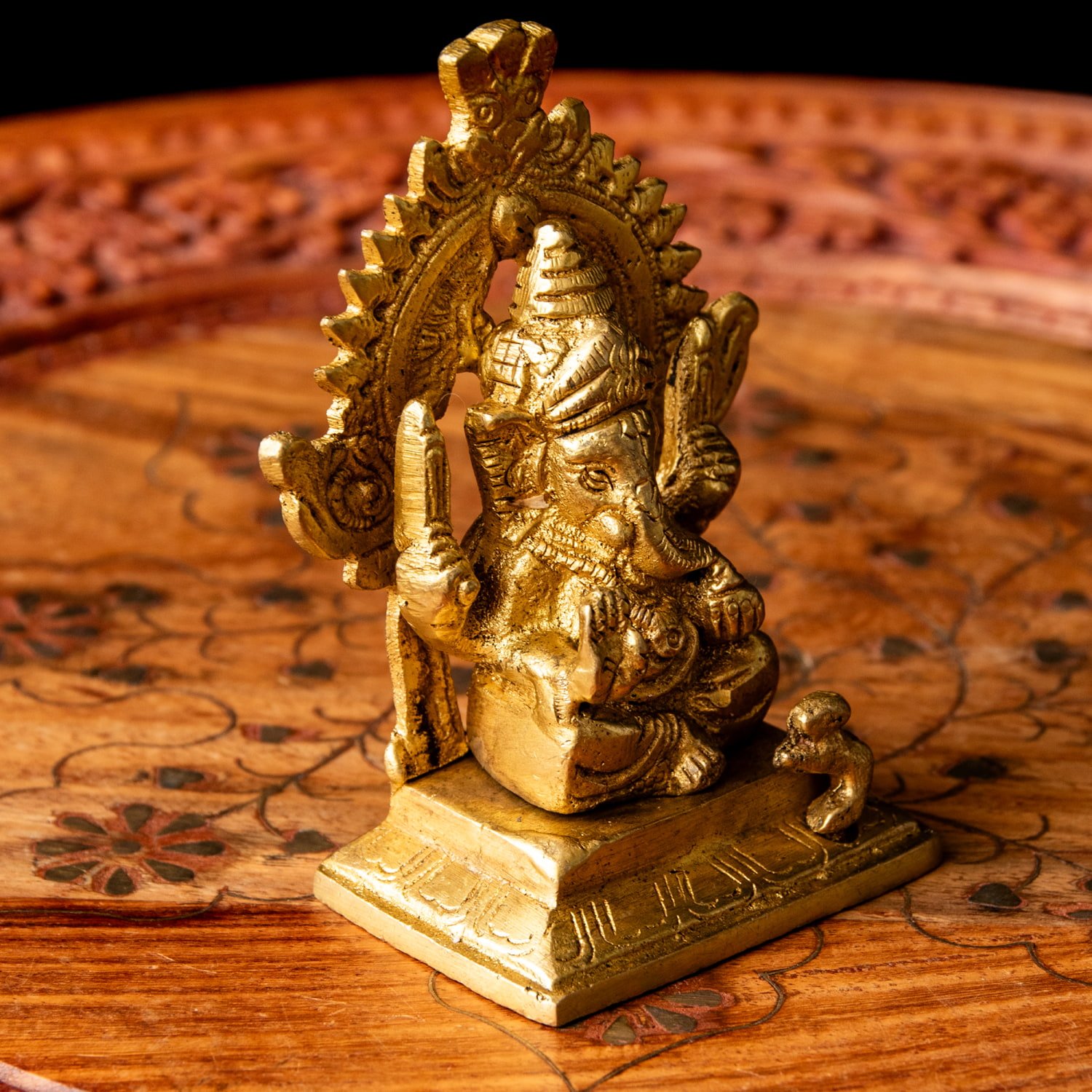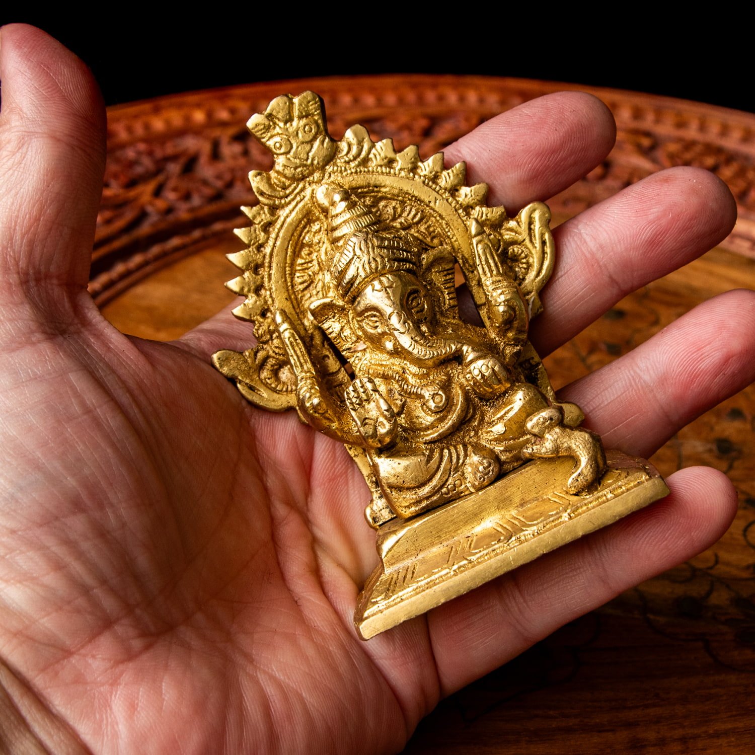 楽器を奏でたり、踊ったり、本を読んだり書いたり、時にはリラックスして寝転がっていたり…多彩なお姿からはその人気ぶりが伺えます。世界一長い物語とも言われるインドの叙事詩『マハーバーラタ』を筆記したのもガネーシャ神だと語られます。音楽や踊りの舞台では、プログラムの最初にガネーシャに祈りを捧げる習慣があります。あらゆる障害を破壊し、願い事の成就へと導いて下さるガネーシャ神は、学問から商売繁盛まで幅広い分野のご利益で信仰され、インドのみならずタイなどの東南アジアでも人気を誇っているのです。| 素材 | ブラス |