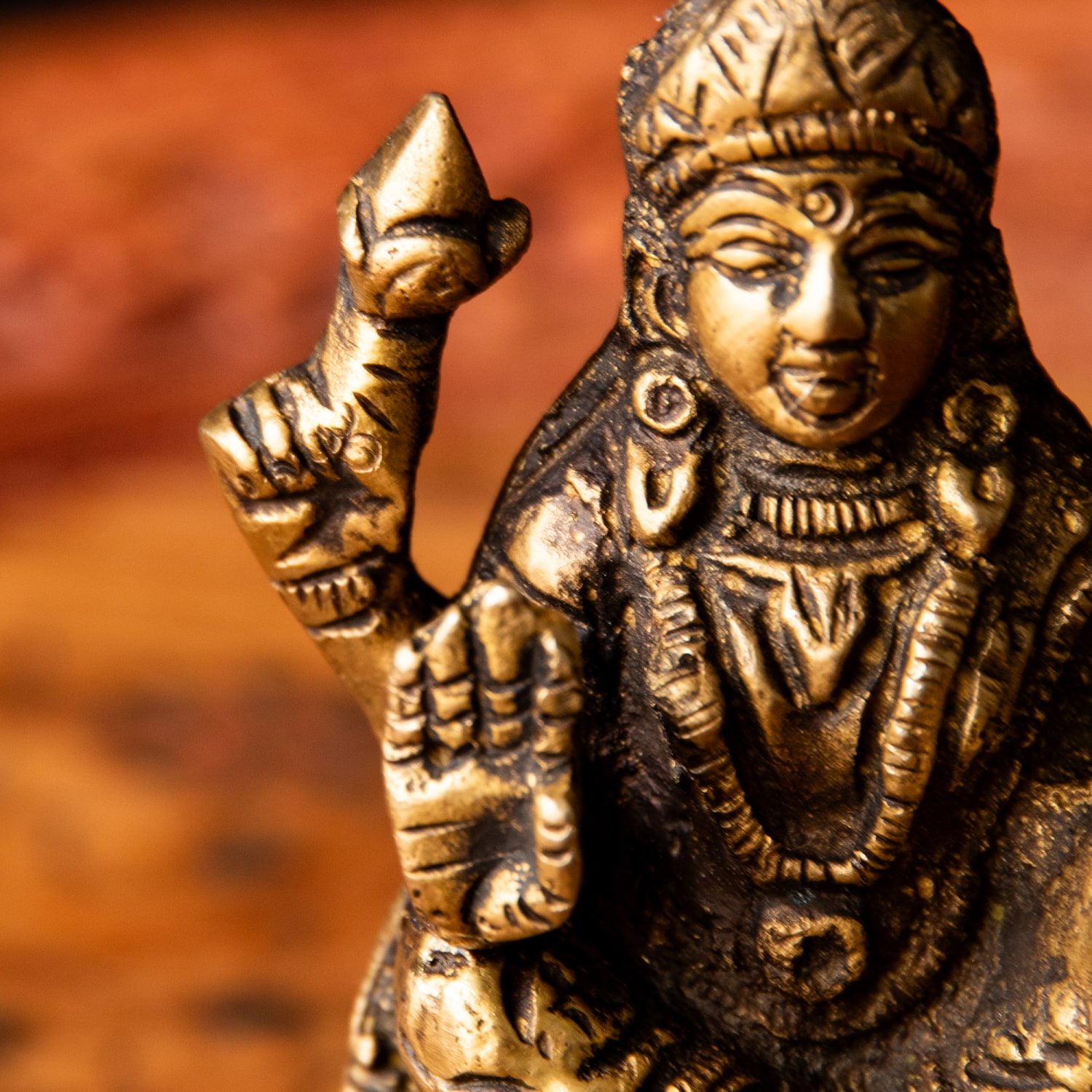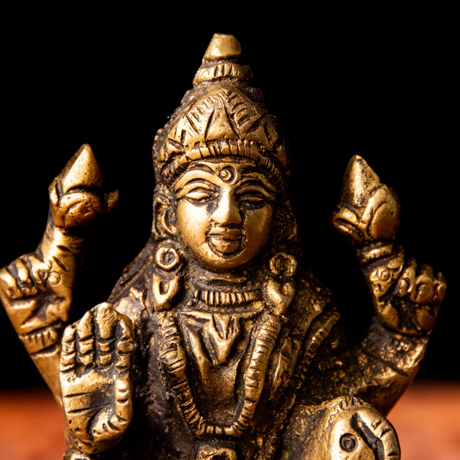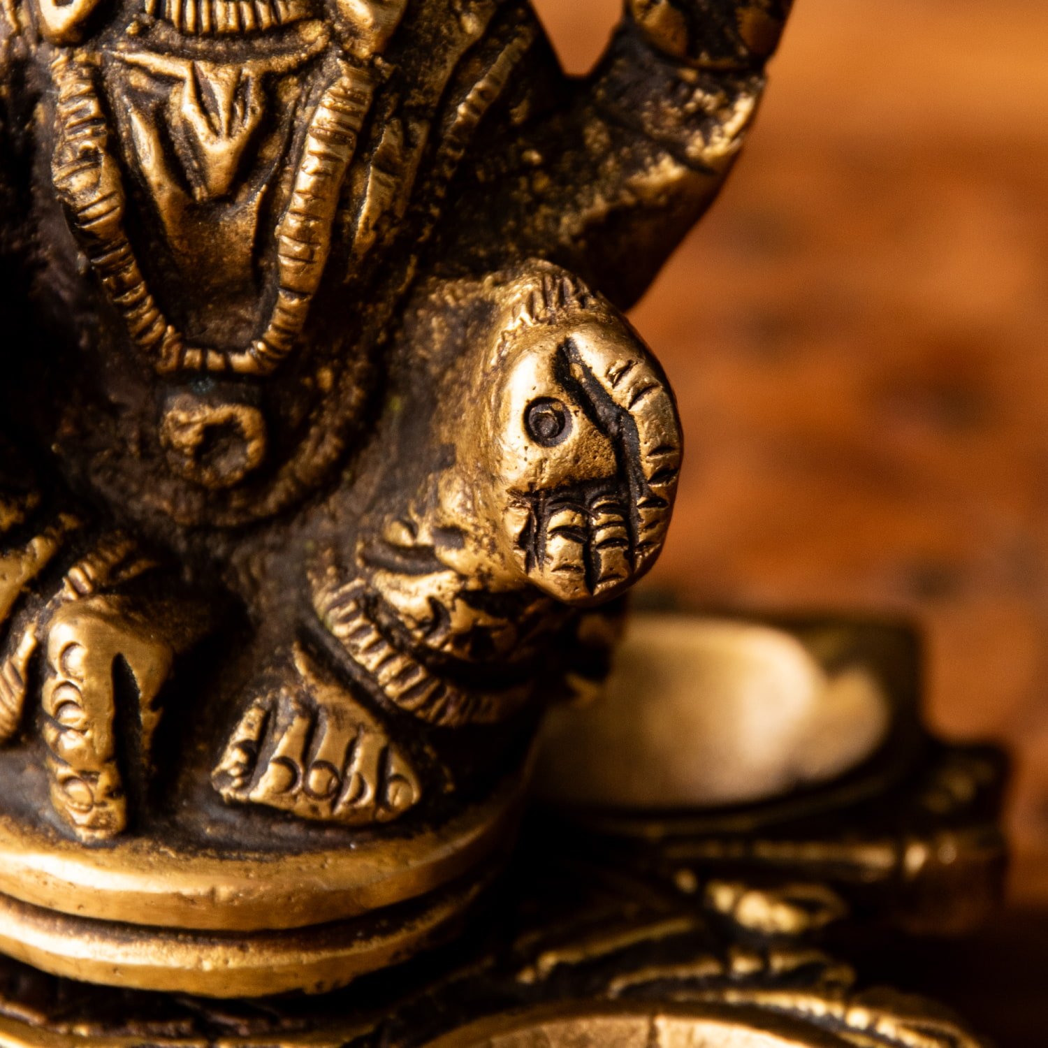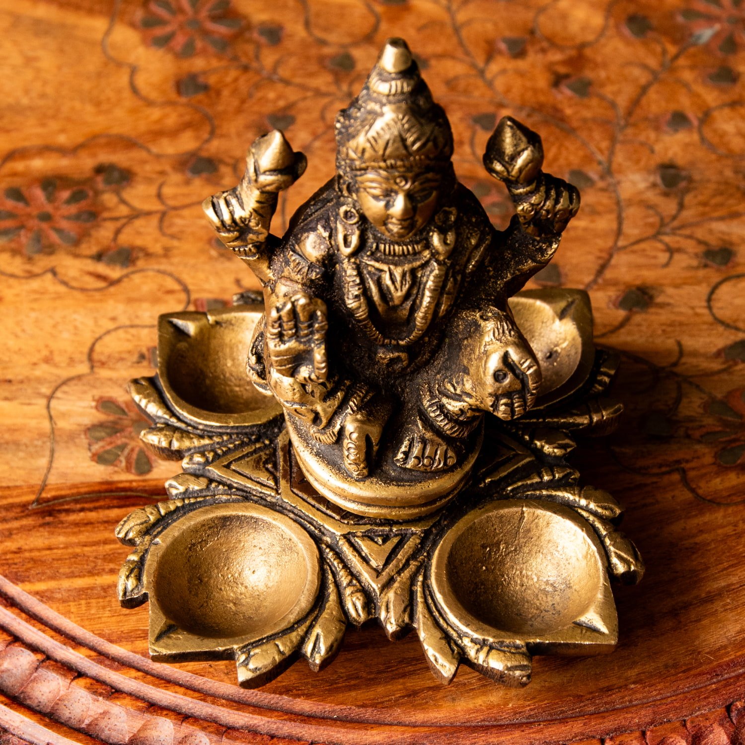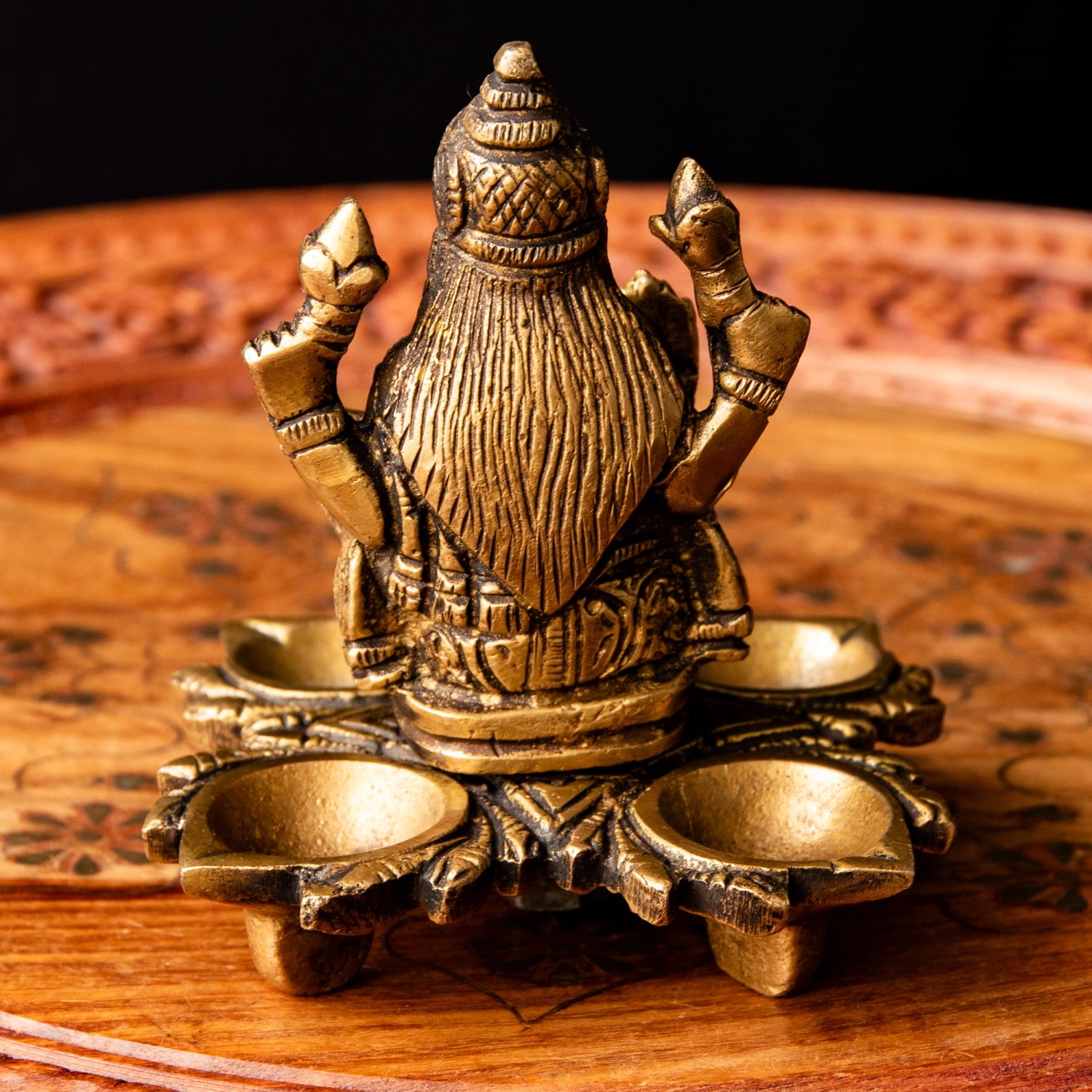 ヴィシュヌ神に甲斐甲斐しく寄り添い、赤や緑などの華やかな色合いのサリーを身に着けたラクシュミー。光の祭典として知られる北インドのディワリ祭では、家中を綺麗に清めて灯明やお菓子で満たし、ラクシュミーが1年の幸福を携えてやって来ることを願います。ラクシュミーの乗り物は一説にはフクロウとされており、ディワリ祭の夜には家々を回って幸せを授けていくのだそうです。古来より仏像製作に使われてきたブラス製で作られているため、実際の重量より重厚感を感じられます。またあまり幅を取らないので、お好きな所に置くことができます。ブラスの鈍い輝きと細かく彫刻された細工にきっとご満足いただけると思います。