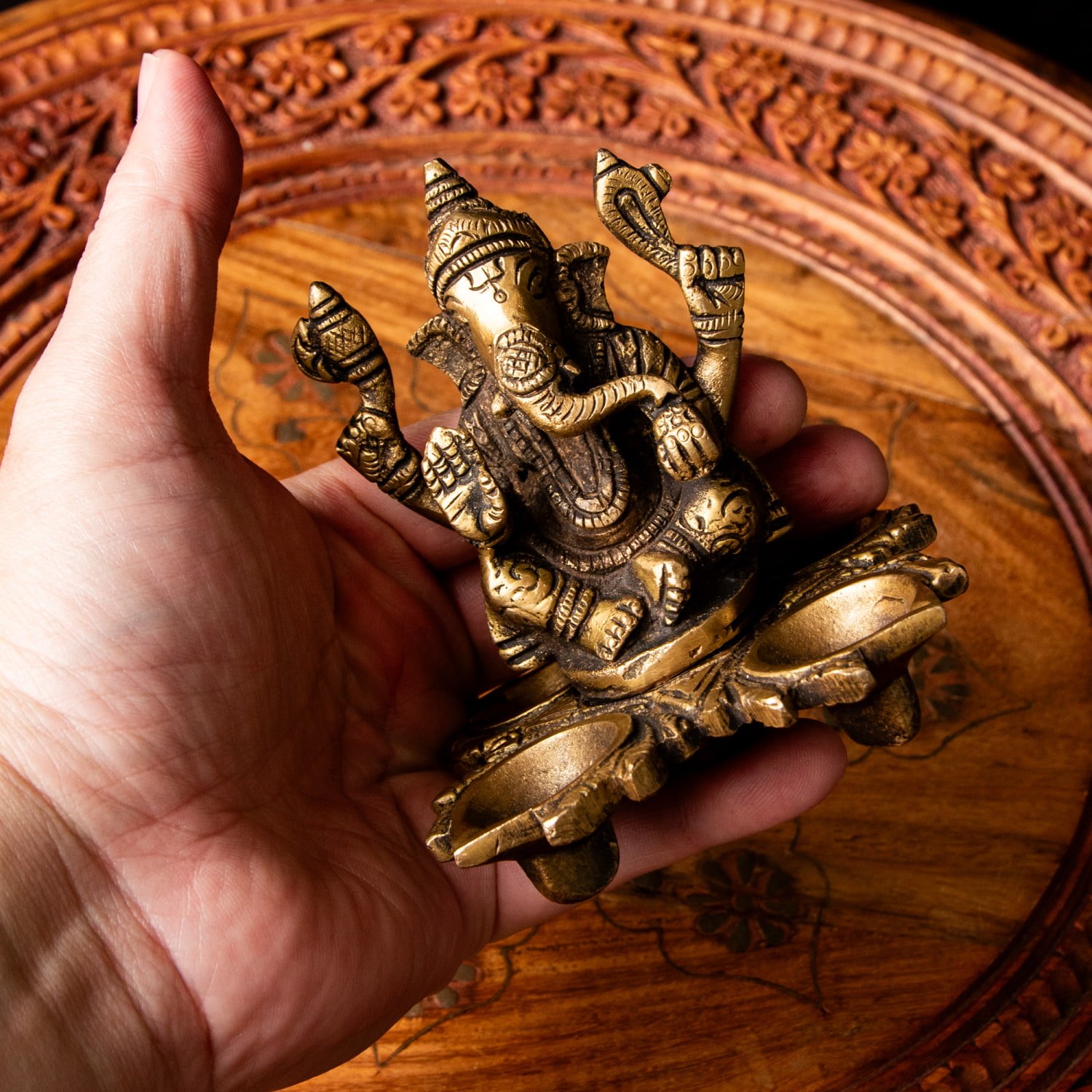 素材は古来より仏像製作に使われてきたブラス製で、耐久性抜群。10年でも20年でもお使い頂け、年月と共に風合いがよくなります。インドではブラスは穢れがつきづらいと考えられていて、神様の像の素材としても多く使用されています。見て、飾ってきっとご満足いただけると思います。大きさも手のひらよりも小さいので、どこに飾っても良い使いやすい一品です。