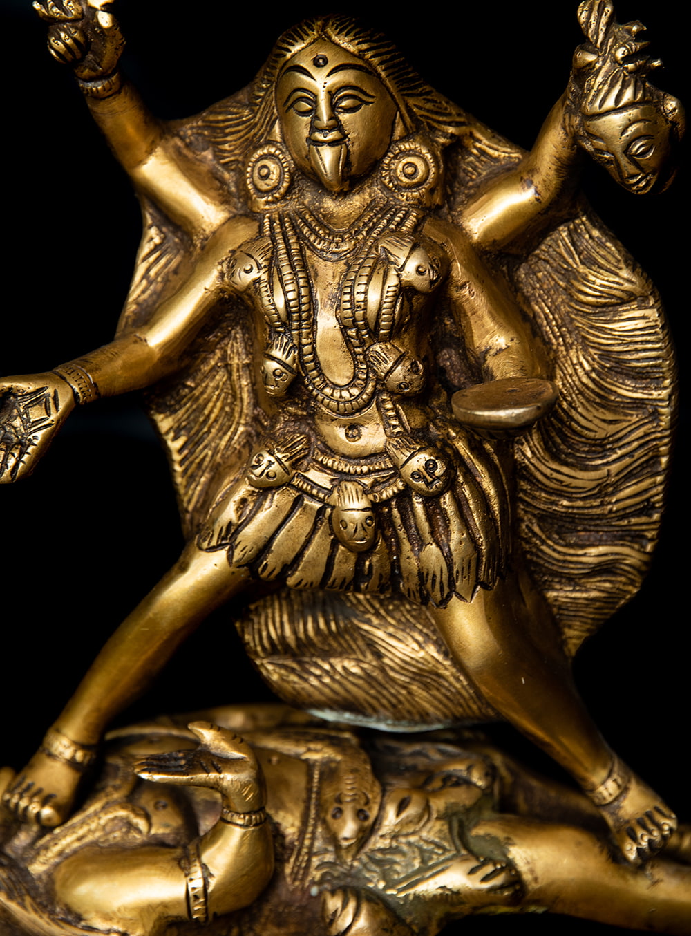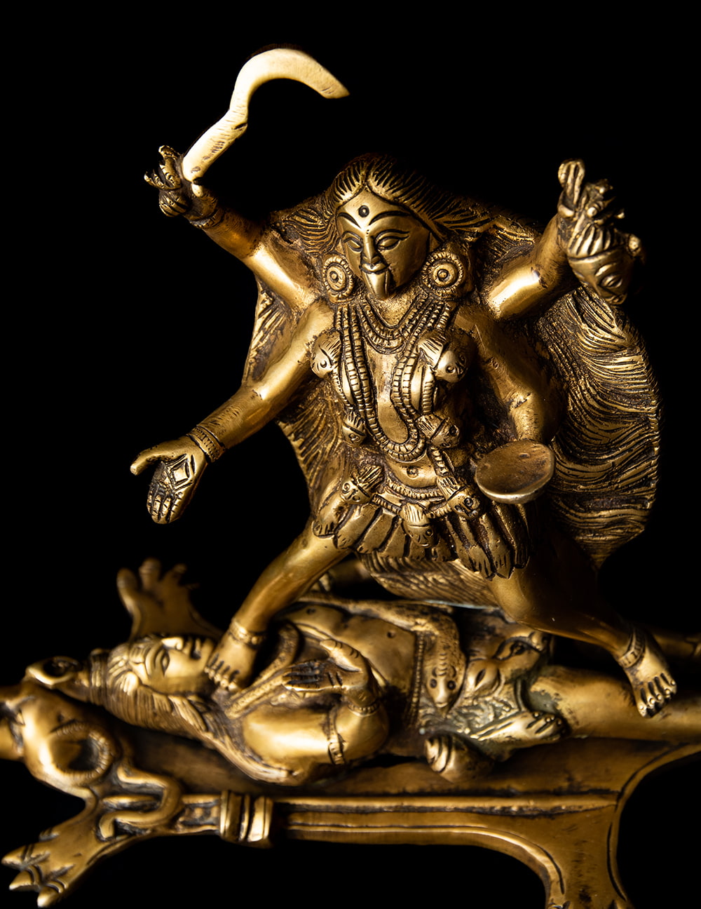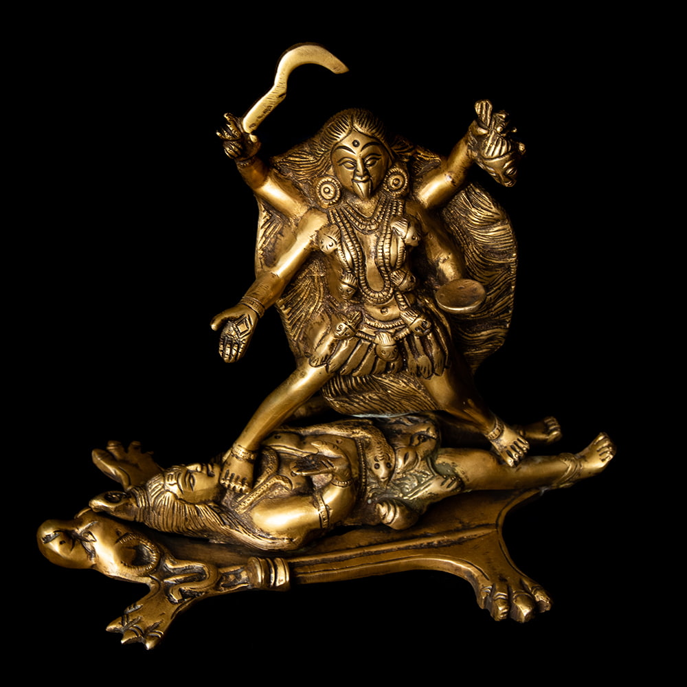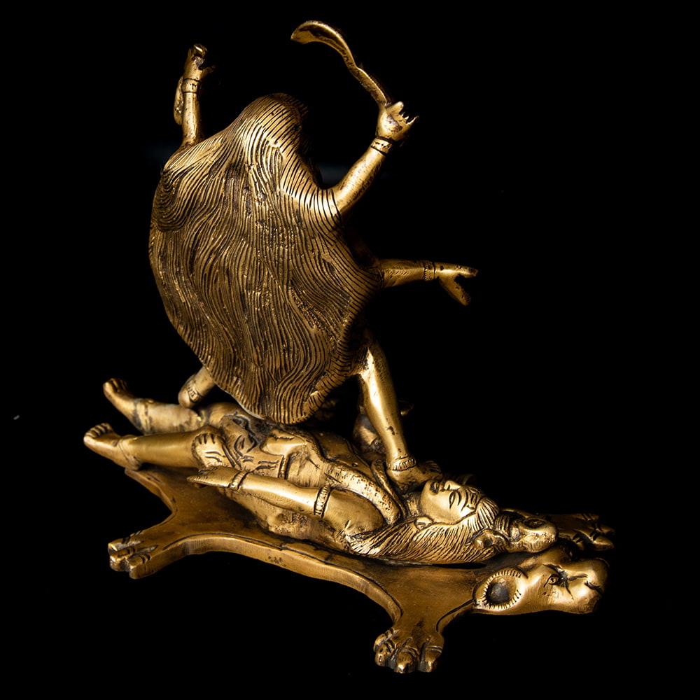 この像はシヴァ神の腹の上で踊るカーリーと呼ばれるモチーフで、勝利に酔ったカーリーが踊り始めると、そのあまりの激しさに大地が粉々に砕けそうだったので、シヴァ神がその足元に横たわり、その衝撃を弱めなければならなかった。この像はこの伝説にに由来しています。