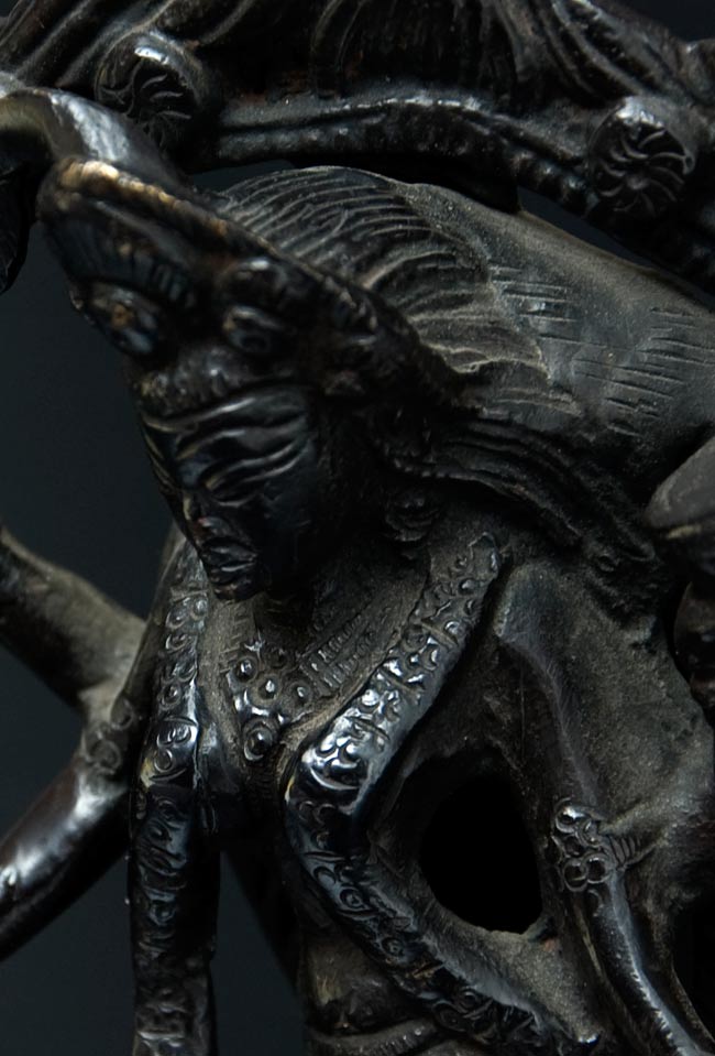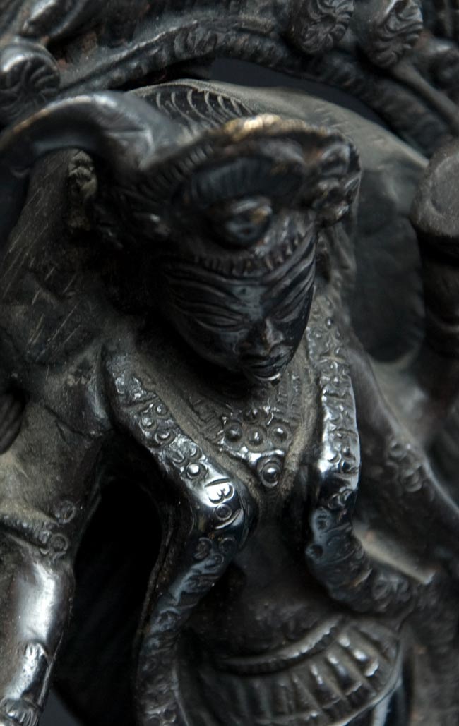 この像はシヴァ神の腹の上で踊るカーリーと呼ばれるモチーフで、勝利に酔ったカーリーが踊り始めると、そのあまりの激しさに大地が粉々に砕けそうだったので、シヴァ神がその足元に横たわり、その衝撃を弱めなければならなかった。この像はこの伝説にに由来しています。