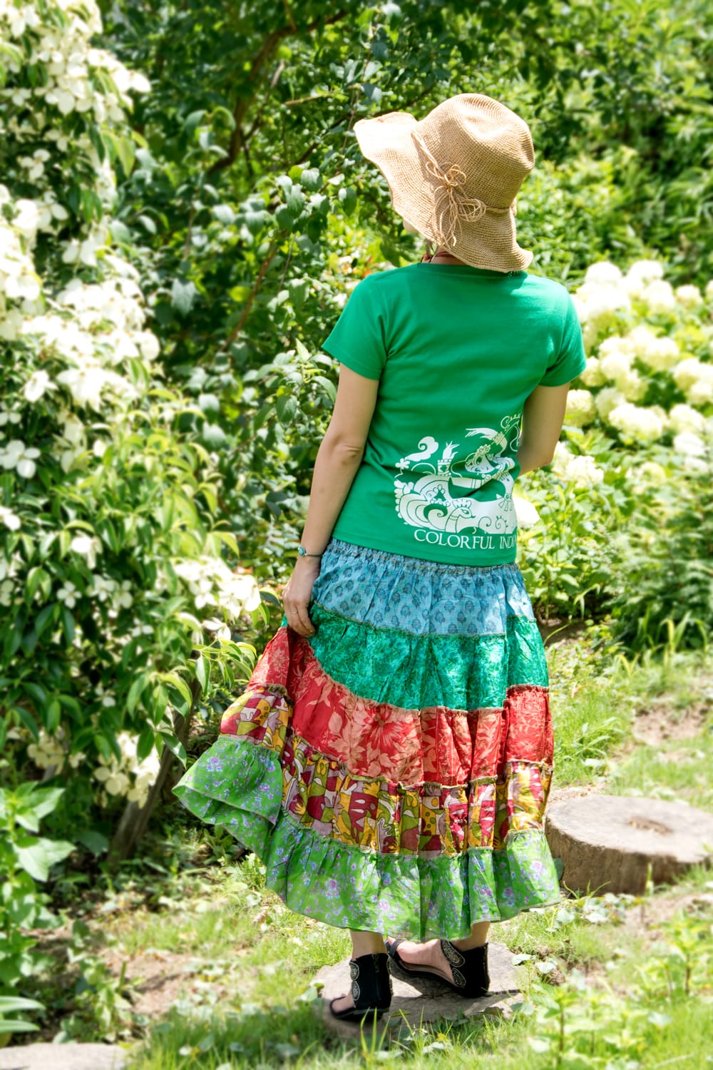 オールドサリーを使用した、可愛いスカートがインドからやって来ました。花柄やペイズリー柄のインドのオールドシルクサリーを使用しており、色鮮やかでとても美しいです。生地の組合せは1点1点異なるため、世界で1枚だけのワンピースです。光沢がある素材で、光の当たり具合によって色が変化します。サラサラと軽やかな質感なので肌さわりも気持ち良く着ていただけます。華やかな場所でもカジュアルでも、着こなし次第で雰囲気を変えてお楽しみいただけます。■その日の気分で着方を選べる!