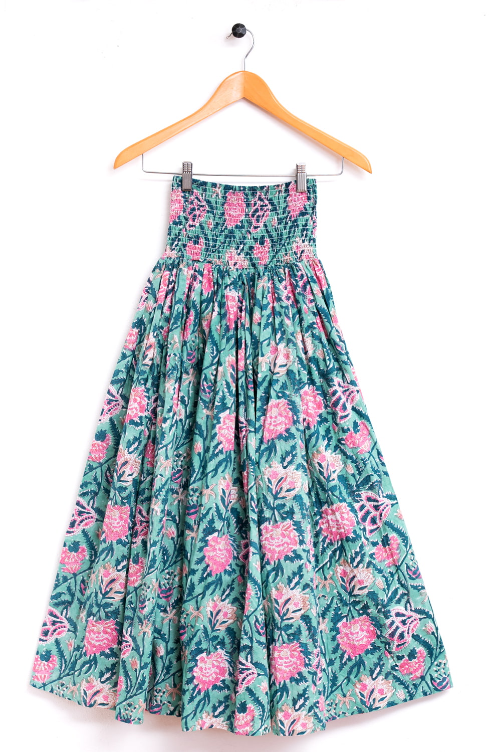 インドのラジャスタン州ジャイプルで古くから継承されて木版染め。デザインを考え、木を彫り、スタンプのように布に押していく。その工程は全て手作業で行われており、色が変わるたびに版を交換するため非常に時間のかかる丁寧な手仕事の賜物といえます。そんな布をふんだんに使用したスカートは非常に贅沢な一品です。全てハンドメイドのため、独特のムラがあり工業製品にはない温かみを感じることができます。■ボリュームのあるデザイン