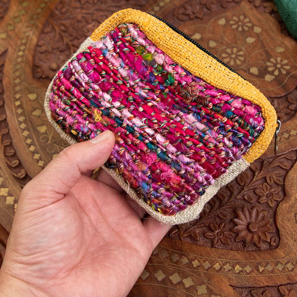 ヘンプとコットン、リサイクルシルクで丁寧に編み込まれた小銭入れがネパールからやって来ました。エスニックな色使いと質感が味わい深く、手作りの温かさが伝わってくる一品です。ジッパーがついているので、使いやすく安心してお使いいただけます。小銭だけでなく、タバコ入れとして使ったり、デジカメケースとして使ったり、リップクリームや目薬などカバンの中で迷子になりがちな小物を入れるのにピッタリですね!