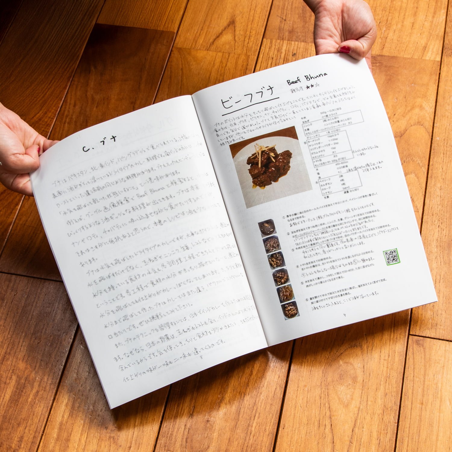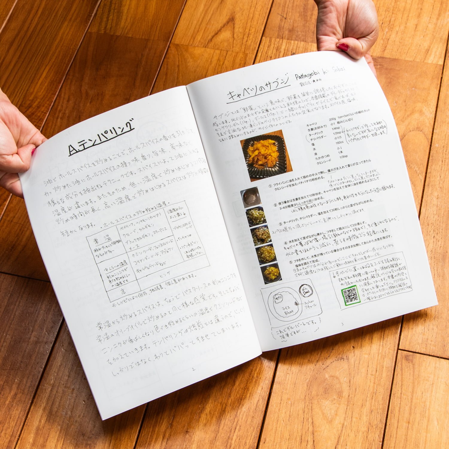 こちらのレシピ本の最大の特徴は、インドカレーの調理テクニックをチャートで眺めながら、一つずつ練習していける点にあります。ホールスパイスの炒め方から、煮込みの工程、気になる「ヒング」の使い方など…スパイスカレーをイチから始める方でも、最後には中級になれるように構成された、教科書的なレシピ本です。A4版の1ページ全体をみっちりと埋め尽くす手書きのテキストに、ラフスケッチ風のイラストが添えられ、まるでプロのシェフのノートを覗かせてもらっているかのような雰囲気です。レシピのページは分かりやすい、調理工程の写真付きです。