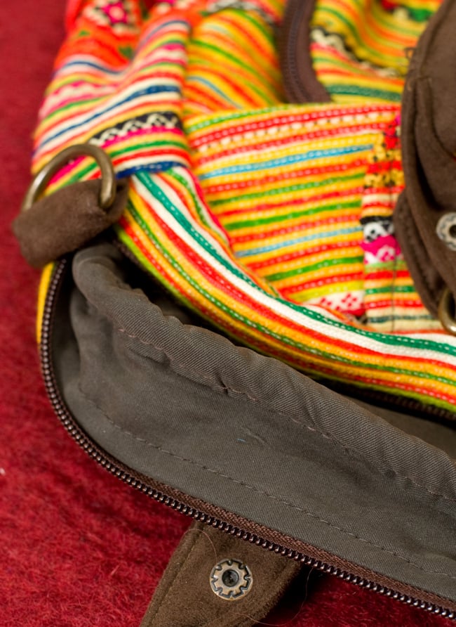 細部に至るまできちんと作られている上質なモン族刺繍のボストンバッグです。モン族の好きなプリント布、モン族刺繍の布地等を組み合わせたカラフルな一品で、シンプルな服装に良くマッチします。持ち手や力のかかりそうな部分には丈夫な合皮を使用。内部には携帯をいれるための小さなポケットが2箇所と、小さなジッパー付きのポケットがあります。外側にもジッパー付きの小さなポケットが2つあり、色々なものが入るのでとても便利です。