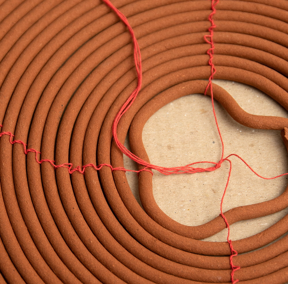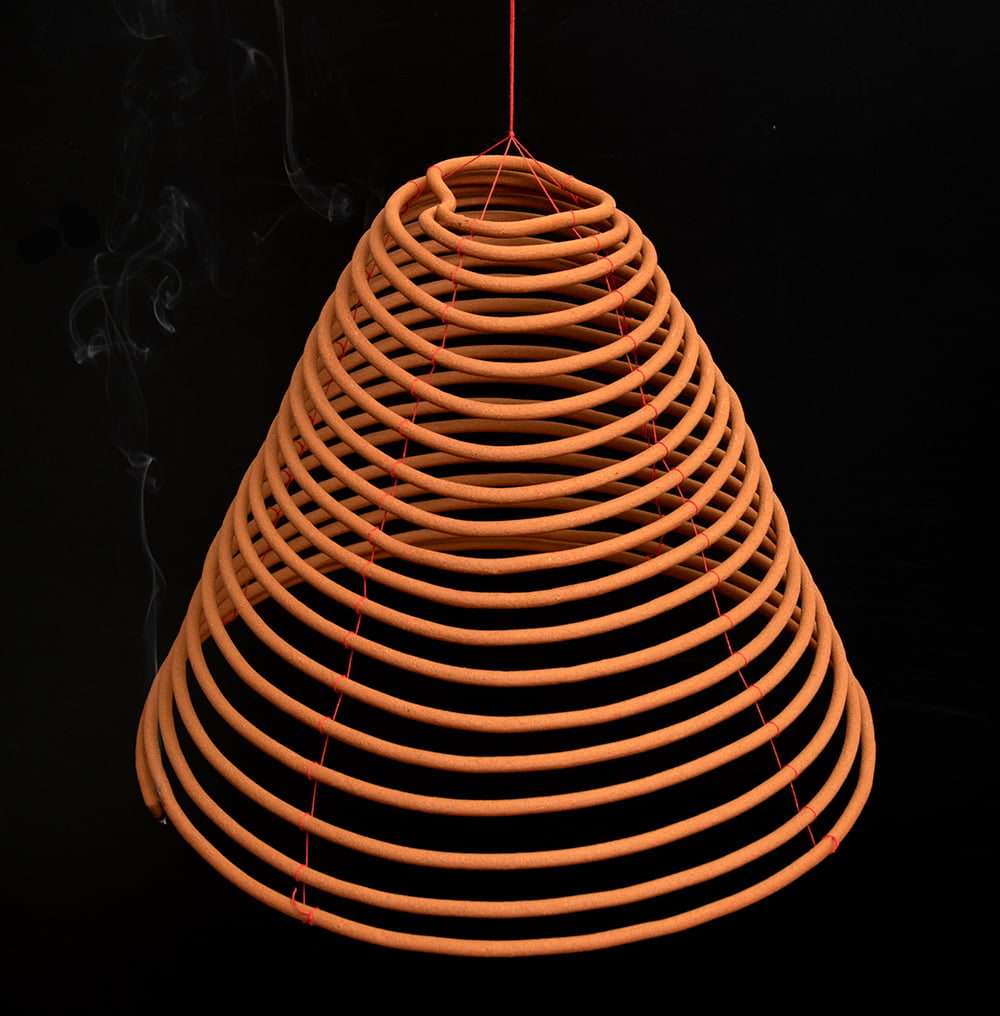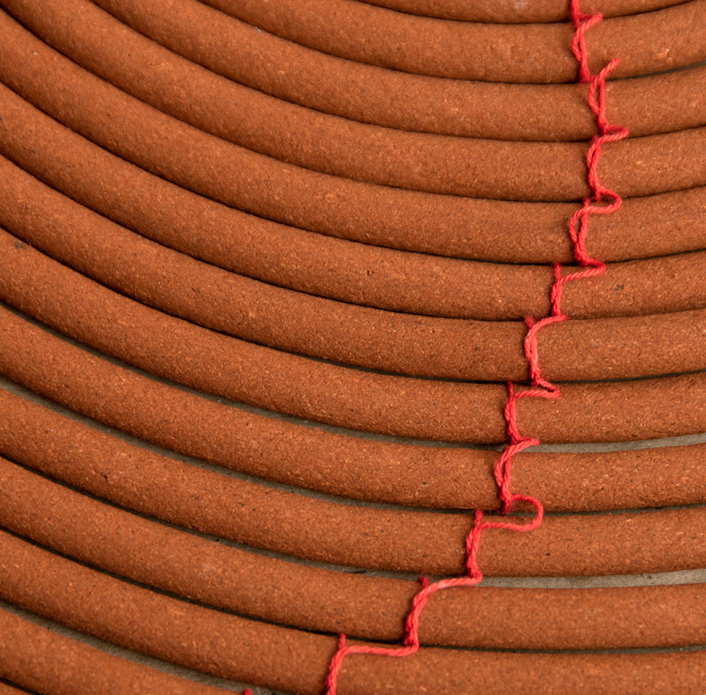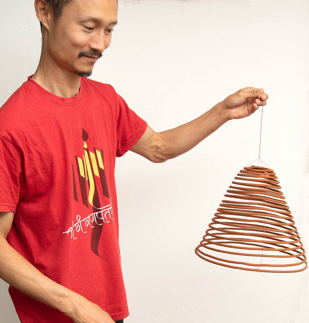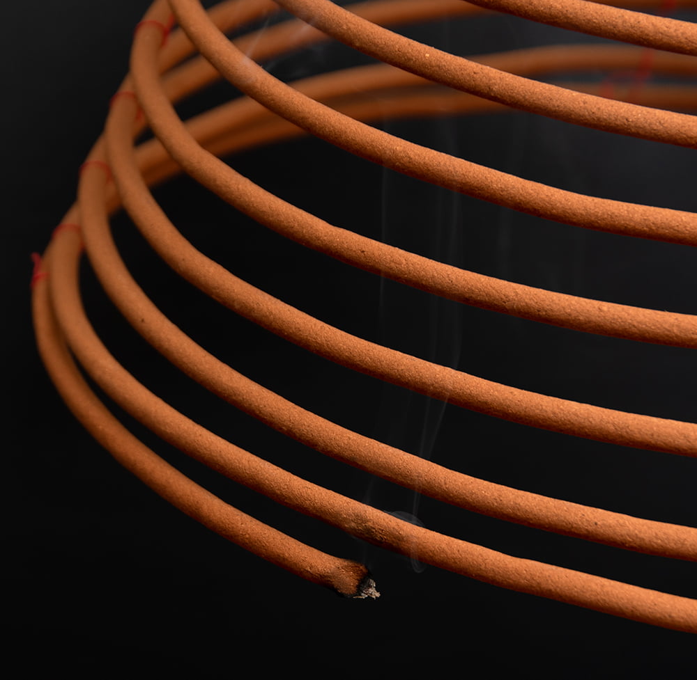 コイル状をしていて、何日も燃え続ける特別なお香です。香港やベトナムのお寺に実際に奉納されているものを、ハノイから直送してもらいました。英語ではcoil incenceなんて呼ばれているようです。一見すると蚊取り線香のような形をしていますが、紐で結ばれていて、つまみ上げるとらせん状に変形して「おっ!」と思わせる面白い形です。吊り下げ型のちょっと珍しいお香ですね。