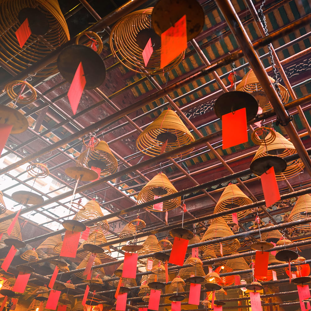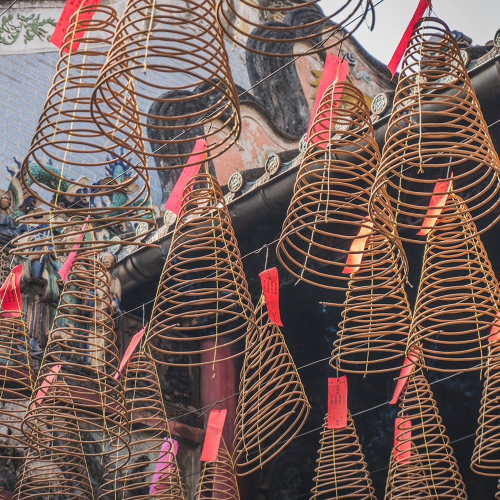 渦巻き型のお線香で有名なのは、香港の文武廟です。文武廟は香港最古の道教寺院として知られていて、近代的な香港の街中に佇むように建っています。文武廟の中に入ると、天井にはこちらの渦巻き型の線香がずらりと吊るされています。ベトナムのハノイでは、チョロンと呼ばれる中華街にある道教寺院である天后宮が有名です。1760年に広東省出身の華僑によって建てられた天后宮では、航海安全の守り神・天后聖母が祀られています。