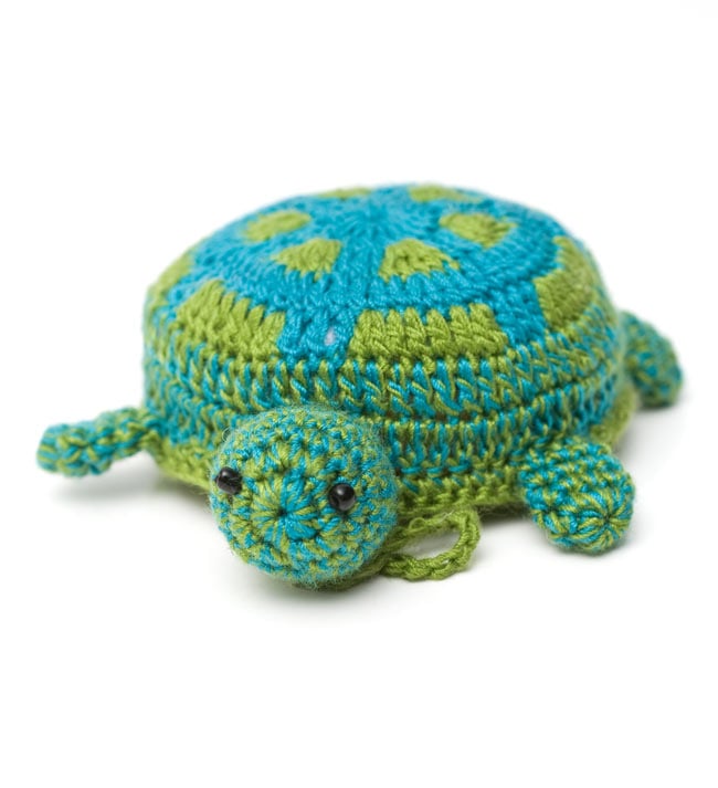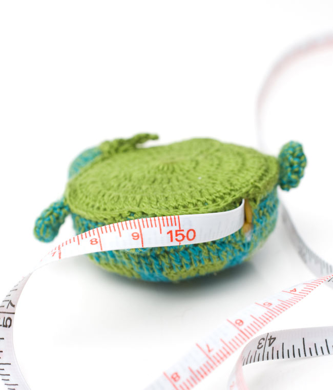 測り終わったらメジャーをしまってあげましょう。亀さんのお腹の中心をグッと押してあげて下さい。スルスルとメジャーが戻っていきますよ。