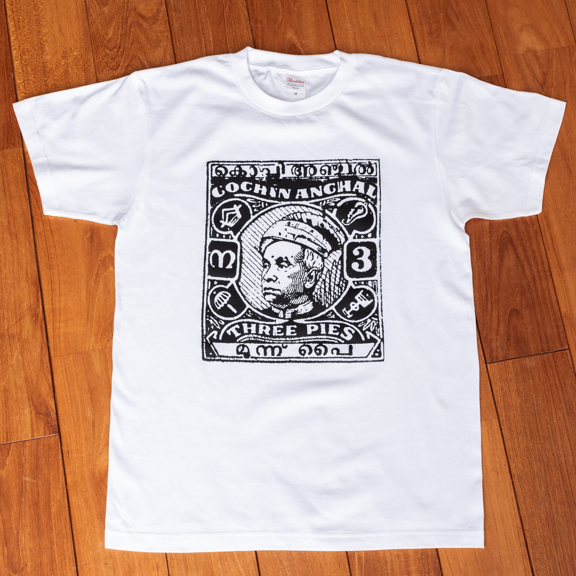 こちらのTシャツは、かつてのインド・コーチン王国の郵便サービス、コーチン・アンチャルが発行した切手をモチーフにしたTシャツです。中心に描かれているのは、かつてのマハラジャであるケーララ・ヴァルマ3世です。シンプルながらも堂々とした彼の肖像が印象的です。今はなき、当時のコーチン王国の文化と歴史を感じさせるデザインです。